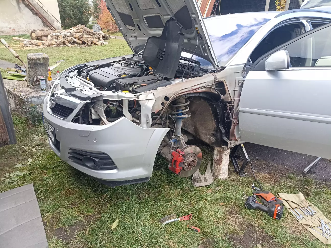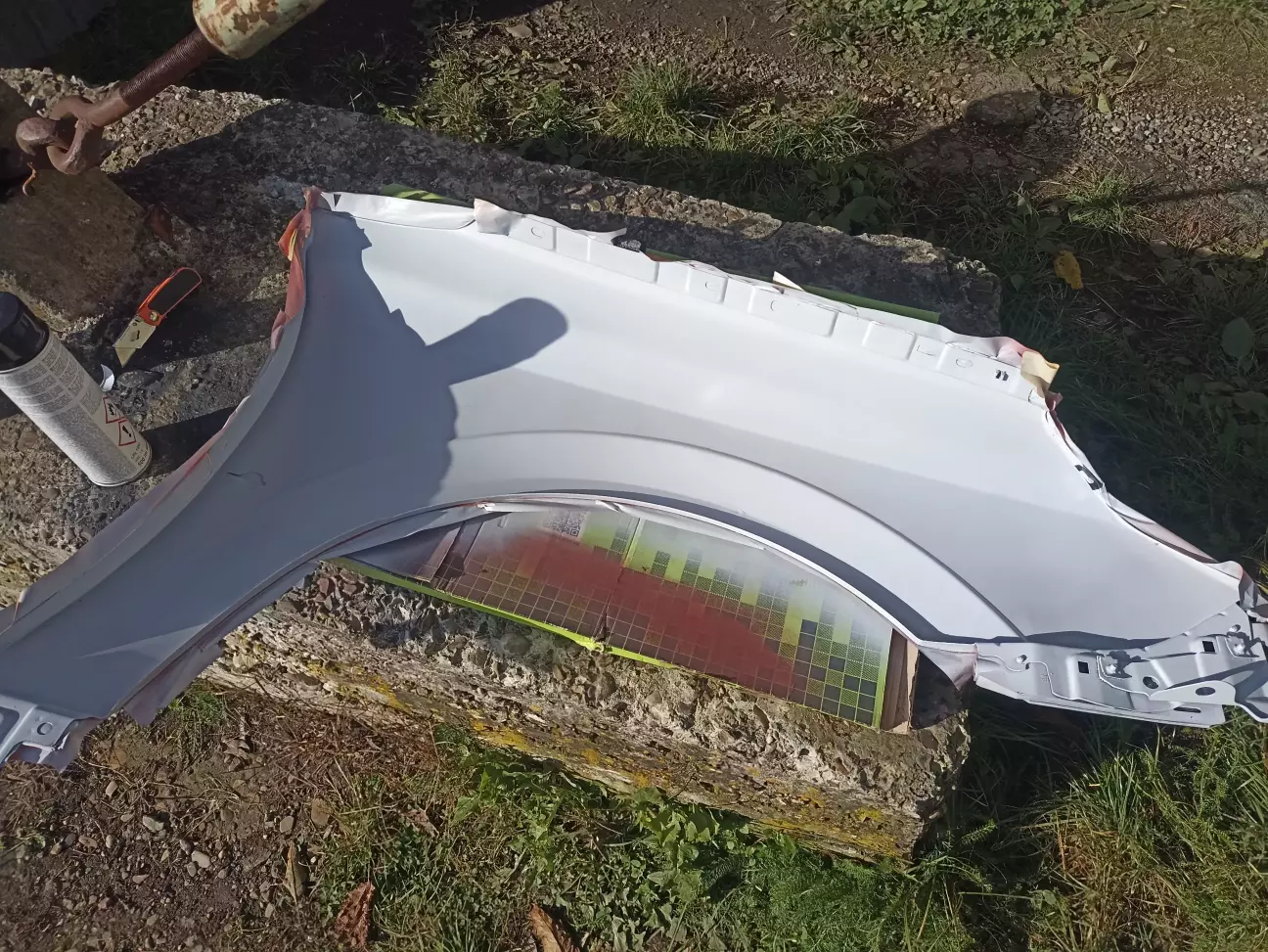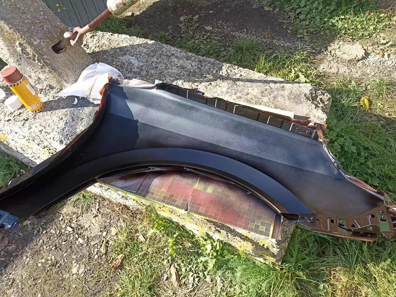 Спочатку була думка зробити це крило, без покраски, місцеві майстри сказали 2000 грн, але черга 1,5 місяці мінімум, та і було місце де фарба все таки лопнула, туди б затікала вода і воно почало б ржавіти. Наступним кроком були обзвонені місцеві розбірки, але в наявності в такому кольорі нічого не було, далі пішов олх, на одній з розбірок було знайдено крило в колір, з направляючими для бампера, далі замовлено знову комплект лед поворотників, та хімія. Крило приїхало, звичайно на ньому були нюанси які потрібно було зробити, тому шуруповерт,перетворювач іржі, кислотний, акриловий грунти та автобіт в поміч: