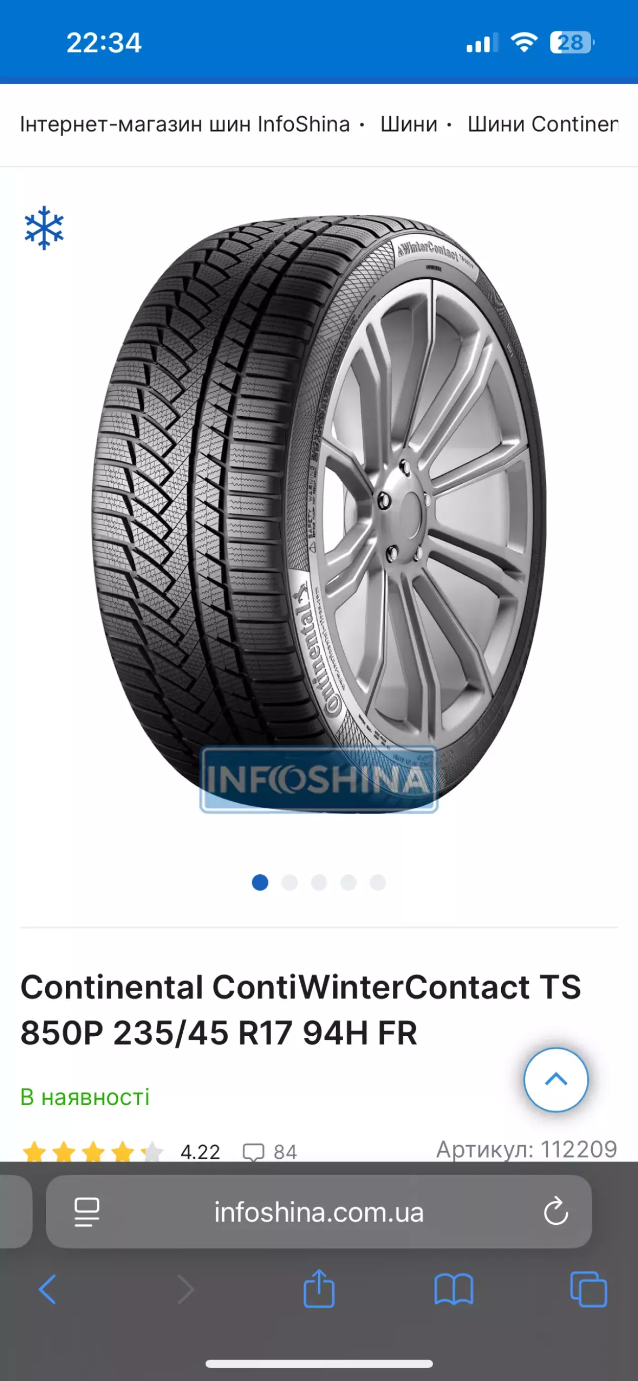 До комплекту взяла собі шини Continental ContiWinterContact TS 850P 235/45 R17 94H FR поки ніби задоволена, але є нюанс 😅. У них всередині була липка чорна піна, аби затягувати дрібні проколи. Не знайшла на сайті про це інформації на момент замовлення. На монтажі мені сказали, що дуууже великий геморой їх латати в разі серйозного проколу. Цьому я не дуже рада.