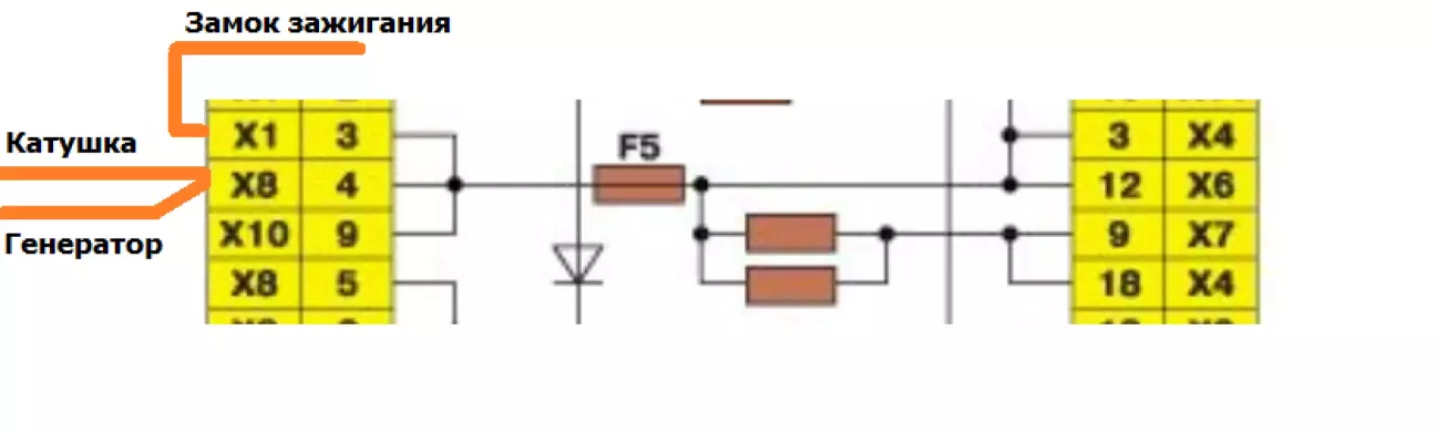 Генератор та катушка підключені до виводу Х8:4, і він ще з'єднаний з виходом Х7:9. Це теж вихід на передній жгут, і цей вихід підключений через резистори-наскільки я розумію туди підключено збудження на 2141 з двигунами ВАЗ, чому так не зробили на УЗАМ-питання цікаве. До цього виходу параллельно підключений вихід Х4:18, це жгут який іде в салон, під торпедою, тож якщо встановити приборку на 10 лампочок то можливо туди підключити лампу зарядки.