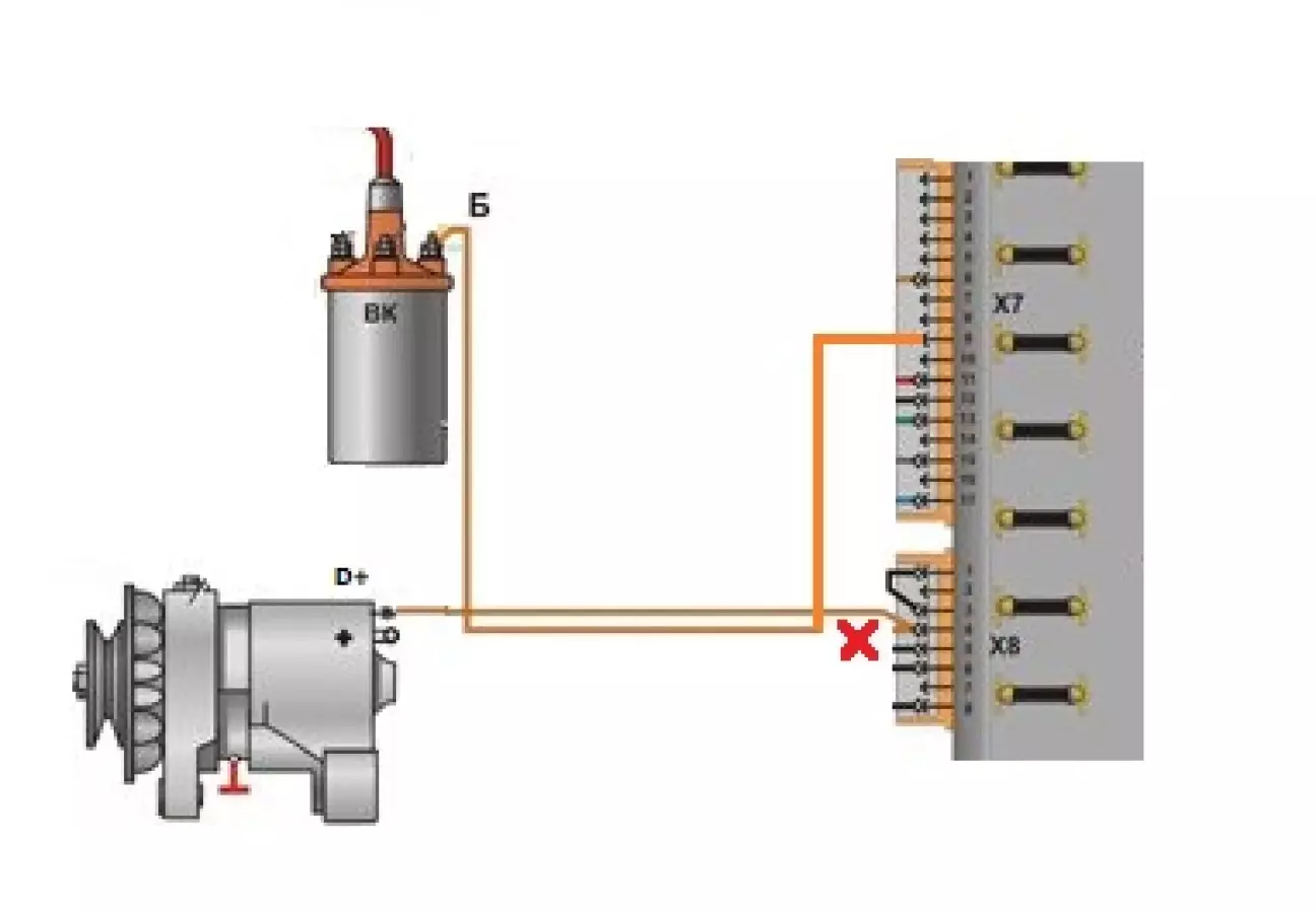 Тож перероблюємо проводку, відключаємо від подвійного помаранчевого дроту з Х8:4 дріт на генератор (в моєму випадку від цього контакту йшли товстий та тонкий дріт, і несподівано на генератор вивився більш товстий дріт), обтискамо на нього маленьку "маму" та втикаємо в роз'єм Х7:9