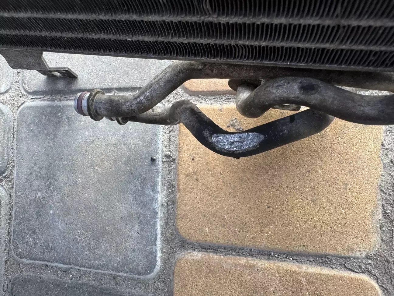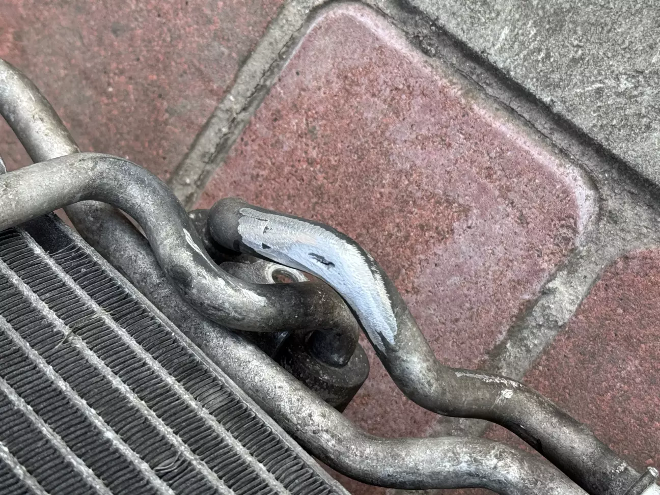 Оказалось что она протерлась об основной радиатор.Не много обмотал ну соответственно это не чем не помогло и весь фреон вышел.