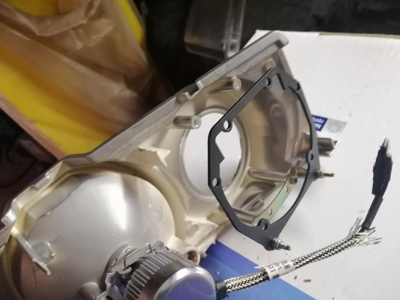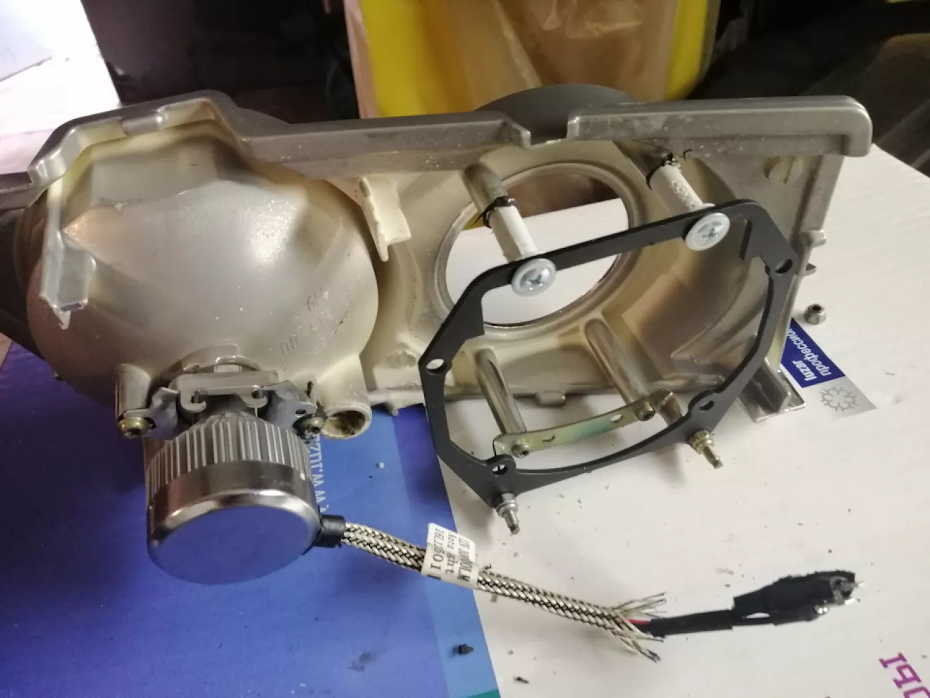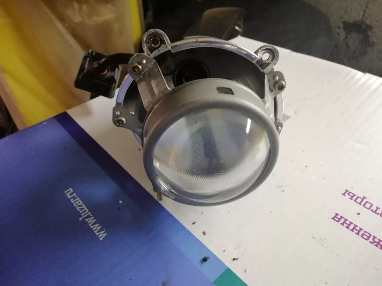 Собрав необходимые детали принялись за роботу, насколько я знаю при снятии-установки фар требуется демонтаж бампера, но в моем случае получилось без демонтажа. Далее самый ответственный момент расклейка фар, используя строительный фен, несколько плоских отверток аккуратно нагреваем по всему периметру место прилегания стекла к корпусу фары, главное не перегреть и не деформировать корпус фары или секла, поддевая отвертками плавно оттягиваем стекло от корпуса. Дальше вынимаем очки, корпус-маска (крепление линзы и отражатель дальнего света), его надо в трех местах отщелкнуть плоской отверткой от фиксаторов. Дальше откручиваем заводскую линзу, устанавливаем переходную рамку, которая подходит только сверху к 2 отверстиям, снизу требуется творческий подход (я использовал 2 строительных дюбеля и шурупы длинной по моему 40 мм). Также нужно подключить шторку линзы параллельно к проводке дальнего света (полюсность не соблюдается для электромагнита). Дальше вычищаем от старого герметика паз крепления стекла к корпусу фары, собираем все в обратном порядке. При склеивании стекла и корпуса новый герметик разогреваем строительным феном для его большей эластичности. Ставим почти готовые фары на автомобиль, используя наждачную бумагу убираем все потертости, потемнения и пятна, до равномерного белого матового стекла (в зависимости от запущенности надо использовать бумагу разной зернистости от 1000 до 2500). Дальше полировочной машинкой и пастой разной зернистости доводим фару до идеальной прозрачности и гладкости, в данном случае тоже надо не перегреть стекло (пластик) фары. Также стекла можно защитить пленкой или лаком, но я пока этого не делал. Выставляем фары по высоте и радуемся результату!