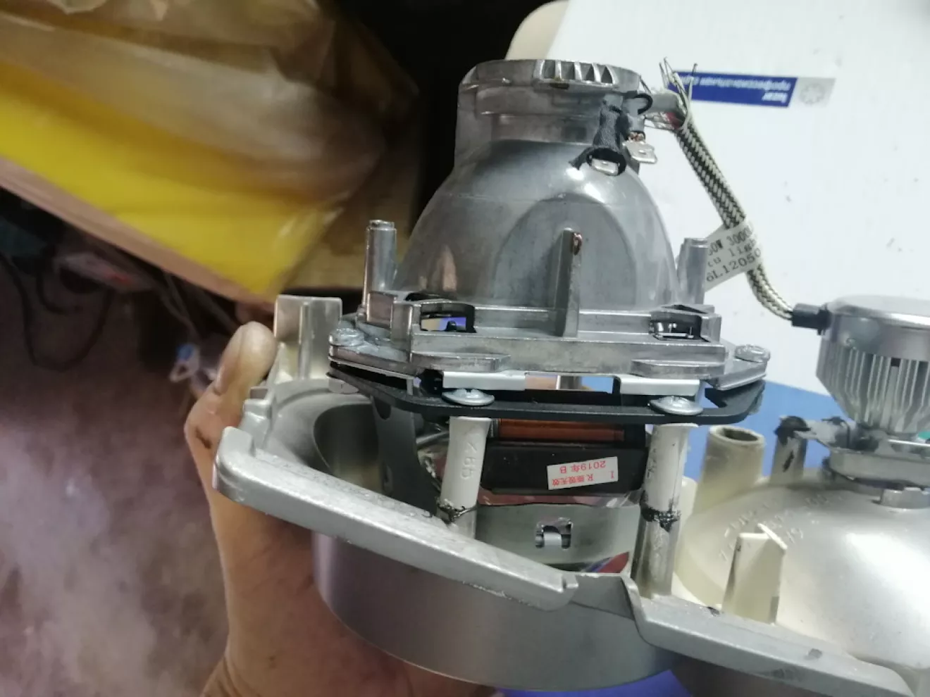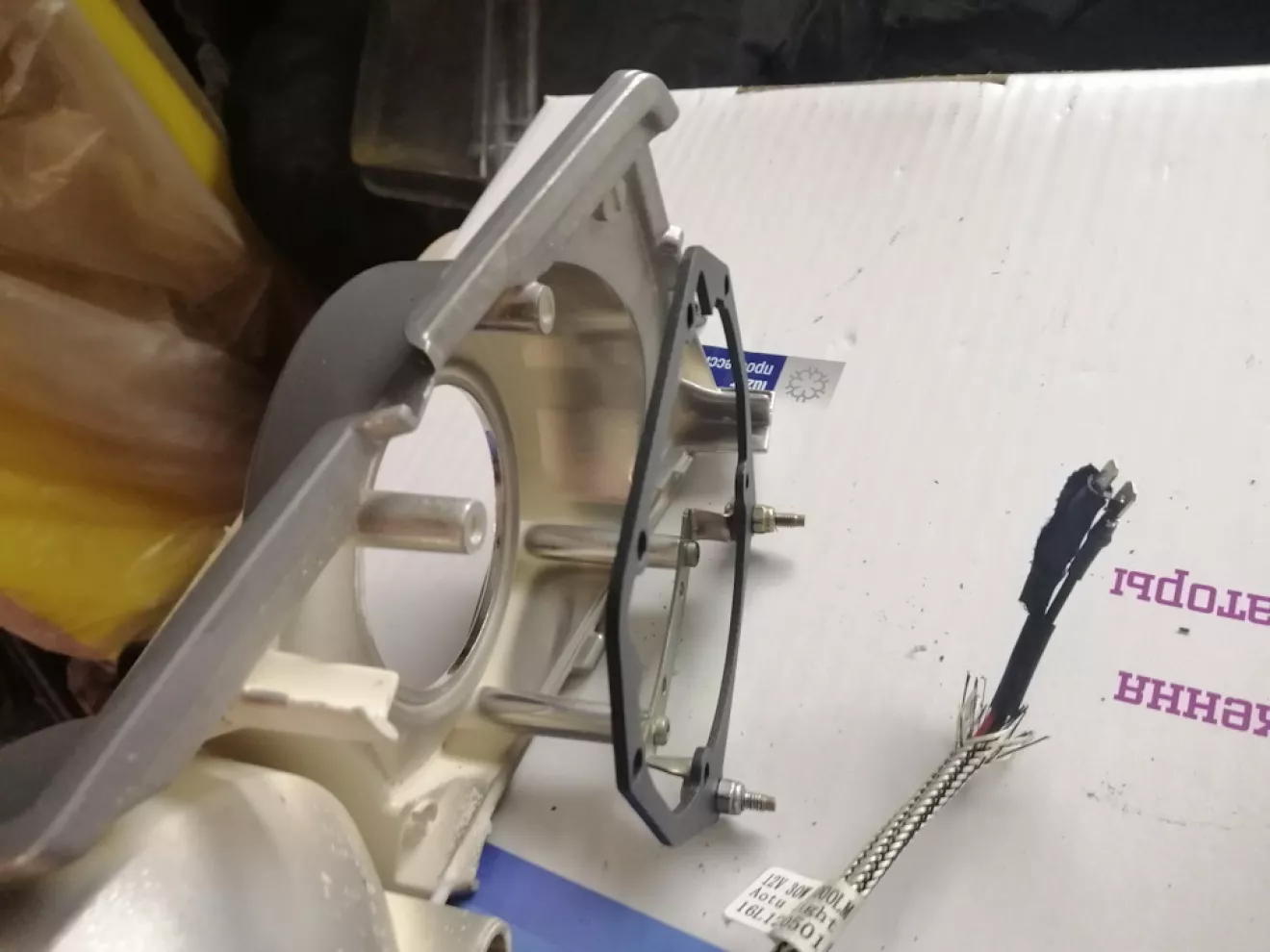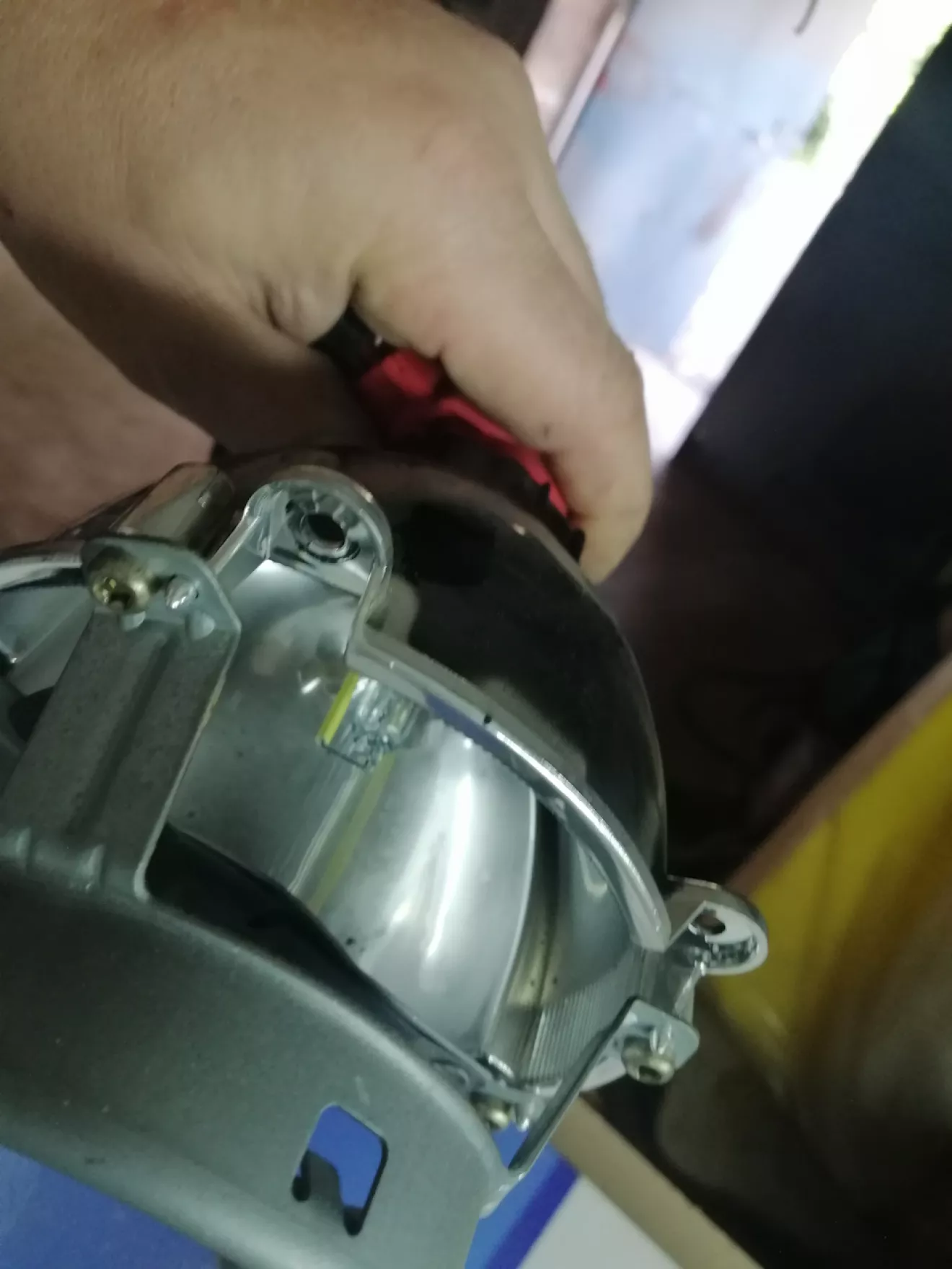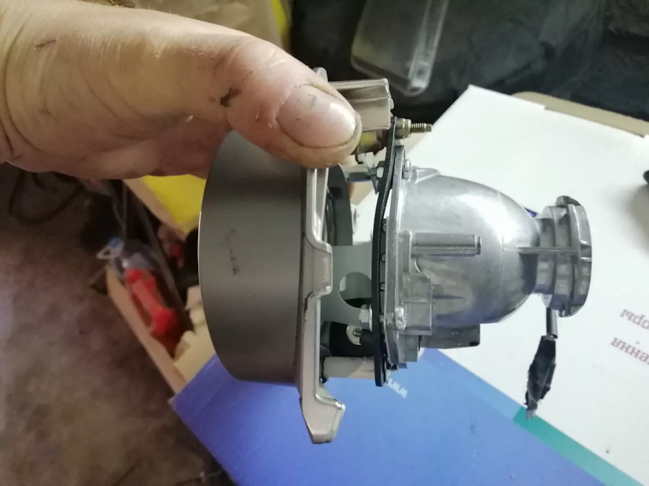 Собрав необходимые детали принялись за роботу, насколько я знаю при снятии-установки фар требуется демонтаж бампера, но в моем случае получилось без демонтажа. Далее самый ответственный момент расклейка фар, используя строительный фен, несколько плоских отверток аккуратно нагреваем по всему периметру место прилегания стекла к корпусу фары, главное не перегреть и не деформировать корпус фары или секла, поддевая отвертками плавно оттягиваем стекло от корпуса. Дальше вынимаем очки, корпус-маска (крепление линзы и отражатель дальнего света), его надо в трех местах отщелкнуть плоской отверткой от фиксаторов. Дальше откручиваем заводскую линзу, устанавливаем переходную рамку, которая подходит только сверху к 2 отверстиям, снизу требуется творческий подход (я использовал 2 строительных дюбеля и шурупы длинной по моему 40 мм). Также нужно подключить шторку линзы параллельно к проводке дальнего света (полюсность не соблюдается для электромагнита). Дальше вычищаем от старого герметика паз крепления стекла к корпусу фары, собираем все в обратном порядке. При склеивании стекла и корпуса новый герметик разогреваем строительным феном для его большей эластичности. Ставим почти готовые фары на автомобиль, используя наждачную бумагу убираем все потертости, потемнения и пятна, до равномерного белого матового стекла (в зависимости от запущенности надо использовать бумагу разной зернистости от 1000 до 2500). Дальше полировочной машинкой и пастой разной зернистости доводим фару до идеальной прозрачности и гладкости, в данном случае тоже надо не перегреть стекло (пластик) фары. Также стекла можно защитить пленкой или лаком, но я пока этого не делал. Выставляем фары по высоте и радуемся результату!