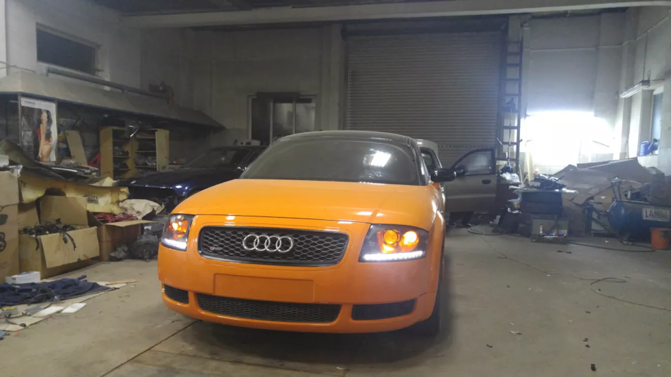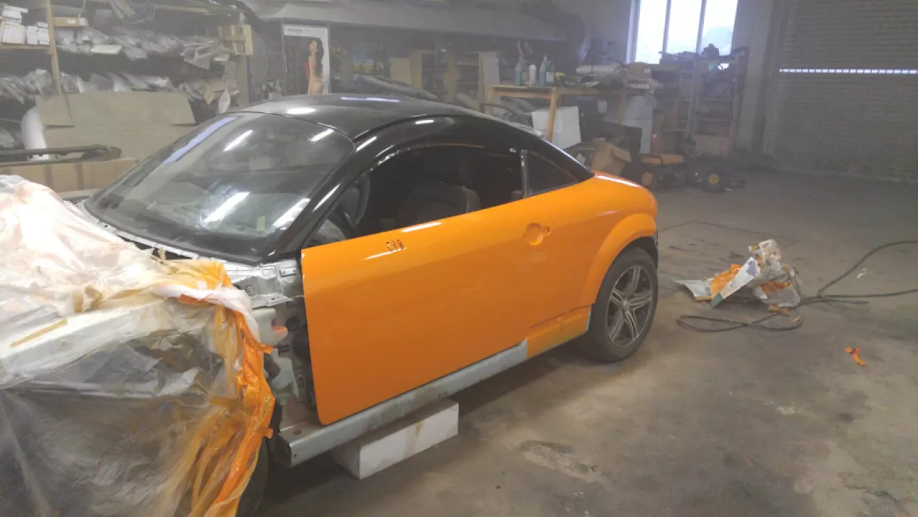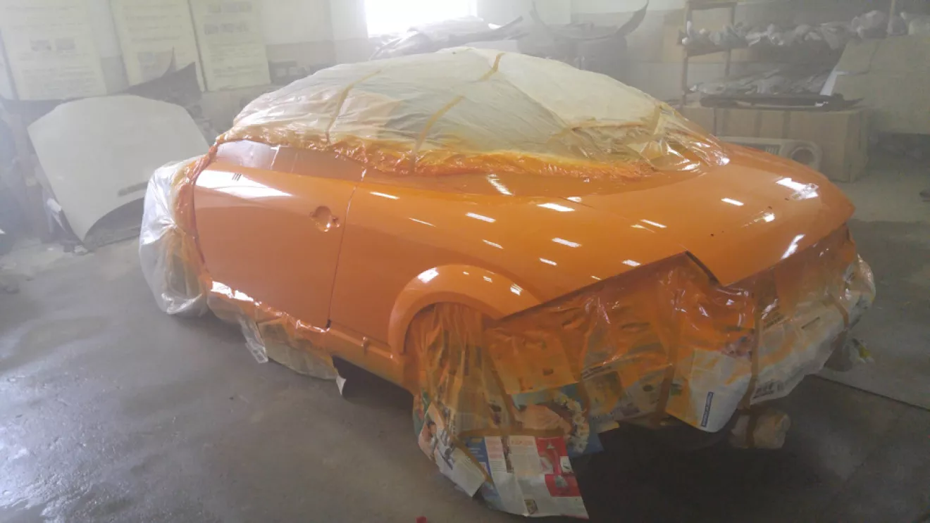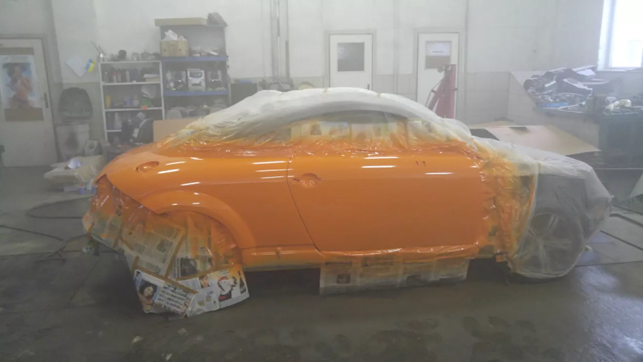 Как я уже и писал раньше, выкинутые деньги на ветер и неделя работы (это я про покраску жидкой резиной Пластидип). Появилось немножко времени и мы решили довезти автомобиль до надлежащего вида, надо было так сделать изначально, но мы не ищем легких путей… Короче содрали пластидип, разобрали автомобиль, подготовили и перекрасили (2 недели работы), писать там особо не чего, все трудоемко и скучно. Крыша так и исталась в черно-оранжевом ксералике, а основной цвет автомобиля так как у новых ТТS (solar orange LY2G). Собственно ниже все видно.Красивые фото собранного автомоюиля будут немного позже.