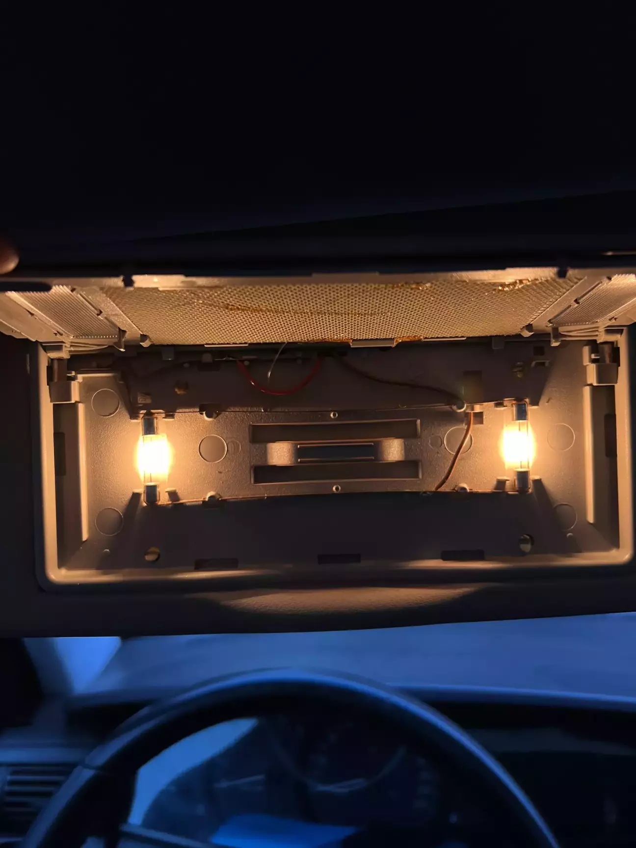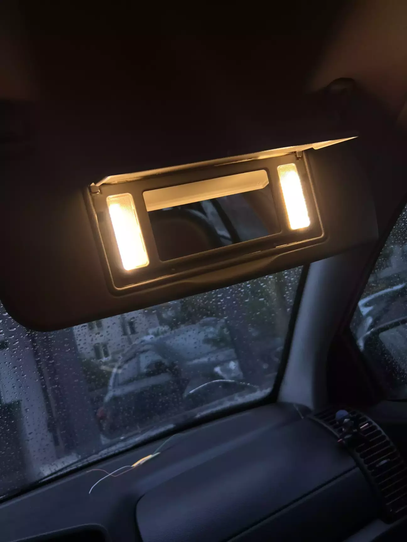 так, на дефлектори і блок люку я поставив світлодіод в стандартному корпусі жовтого кольору, підігнавши і припаявши під розʼємний цоколь, який був до того, а на дзеркало шторок була придбана COB-стрічка з розсіюванням (a.k.a неон), щоб повністю повторювати логіку нитки розжарення.