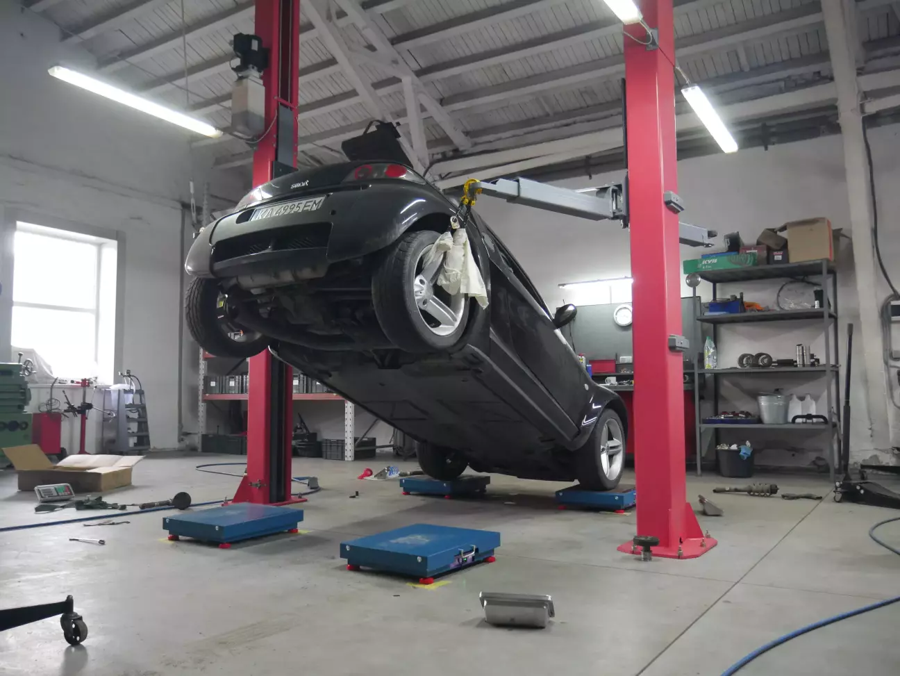 Оскільки вся незалежна підвіска має хід по напівколу при підйомі автомобіля на підйомнику колеса "зкладаються" всередину і коли його опускаєш вісь стає "на диби" - кліренс вище ніж в їздовому положенні. Це, звісно, впливає на розподілення ваги і цифри, які покаже замір. Для того, щоб цей момент мінімізувати я використав по дві металеві пластини, між якими наніс звичайну літієву змазку для підшипників - це стара методика, якою користуються для домашнього регулювання сходження. При опусканні автомобілю пластини роз'їжджаються і кліренс стає в норму. Додатково трошки покачати і прокотити вперед-назад.