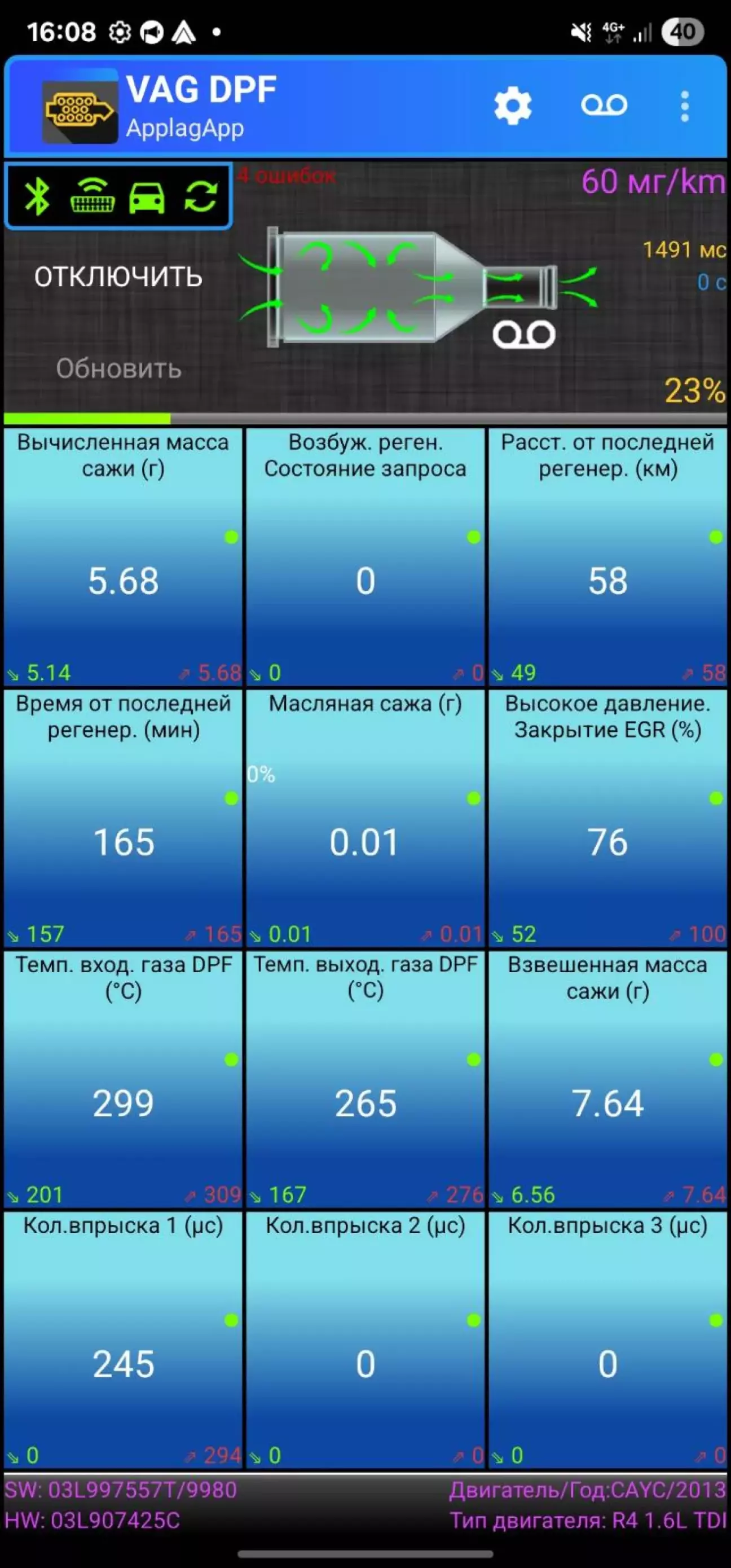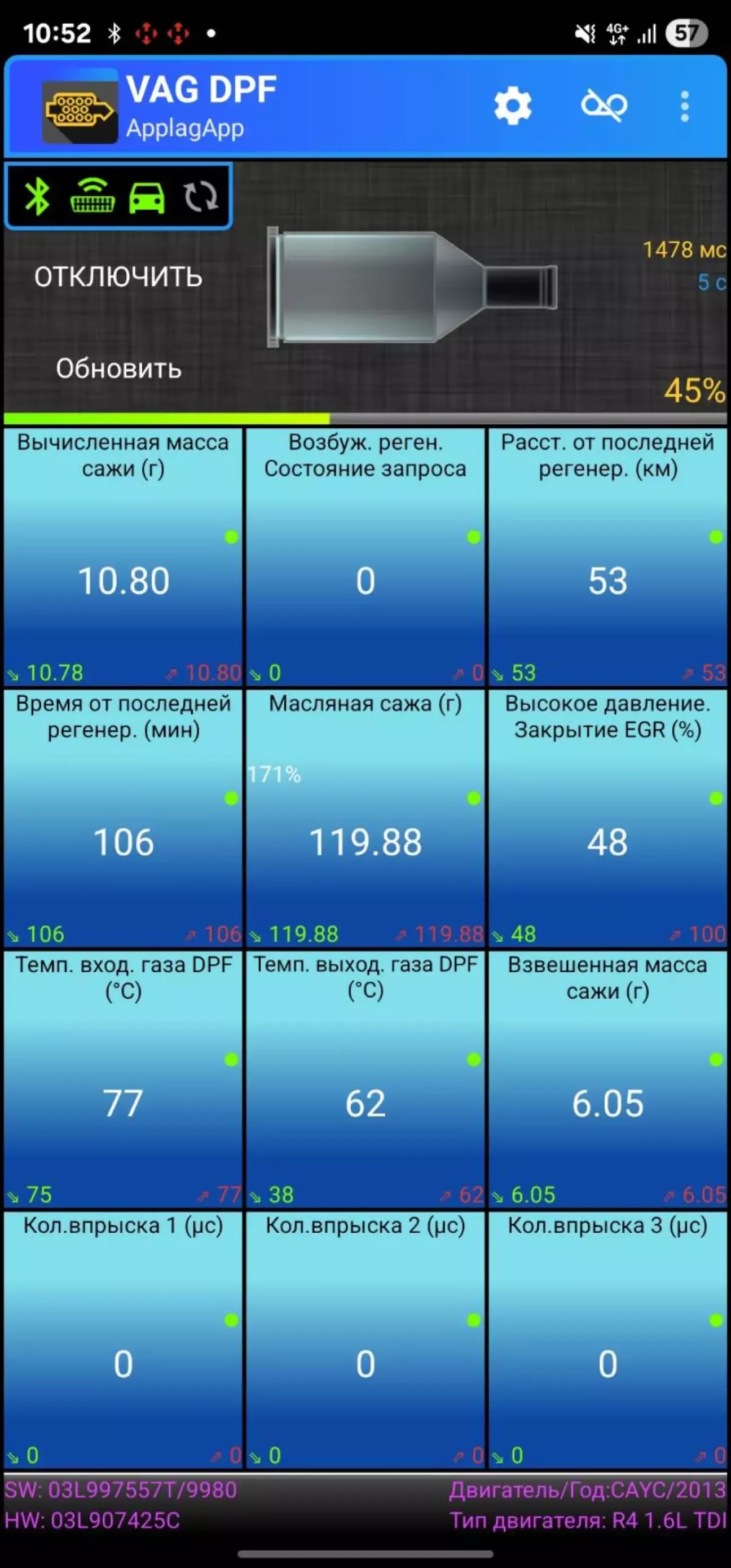 після цього всього було незначне покращення результату, але шляхом моніторингу стану екології через VAG DPF було помічено постіне доливання палива "Post injection 1 (us)"/(Кол.впрыска 1 (uc)". Людина з СТО сказала, що можливо вони забули задаптувати новий EGR, тому за допомогою VSD була спроба це самостійно зробити, але машина задерла оберти до 1.5 тис та нічого не відбувалось.