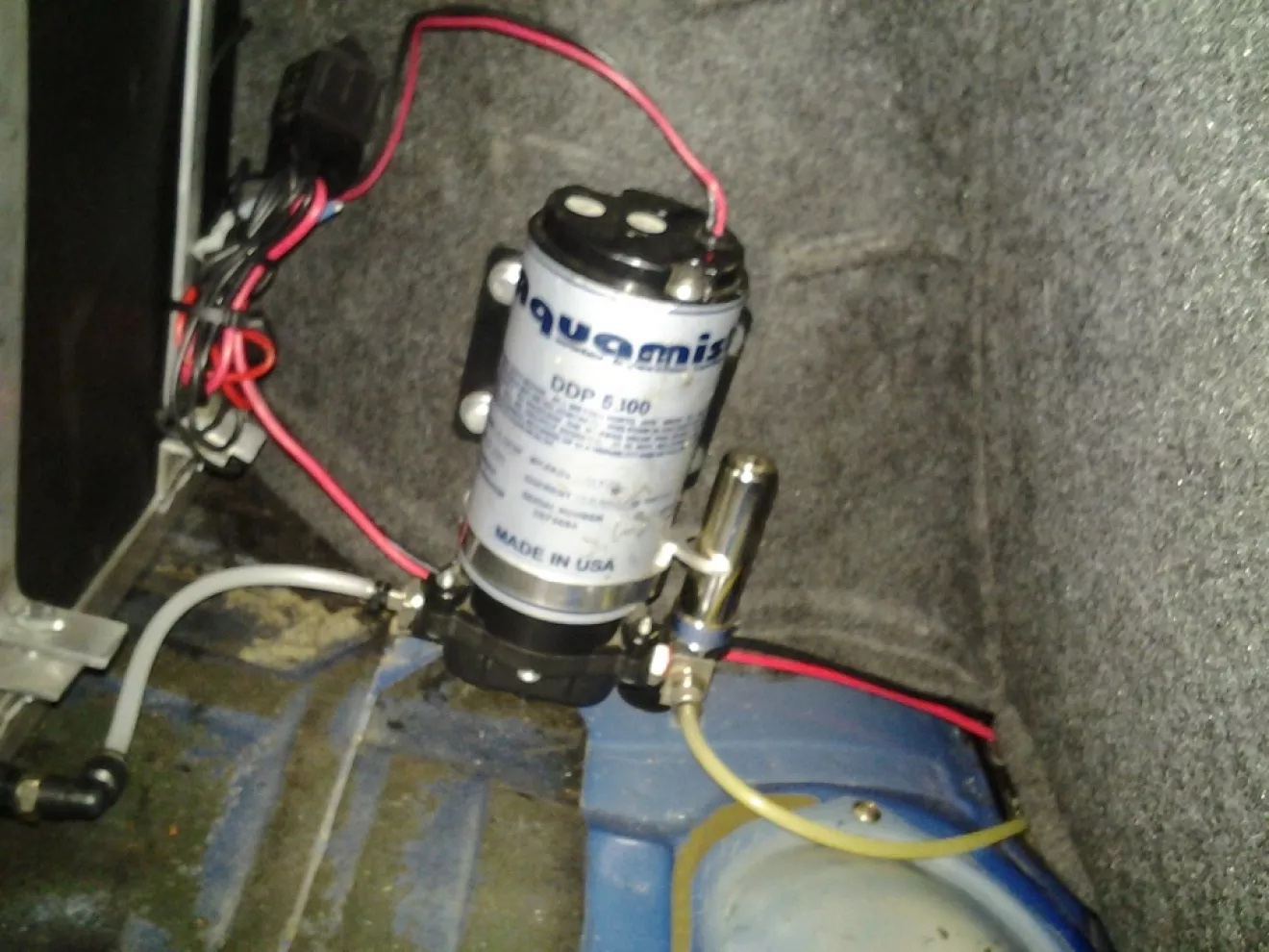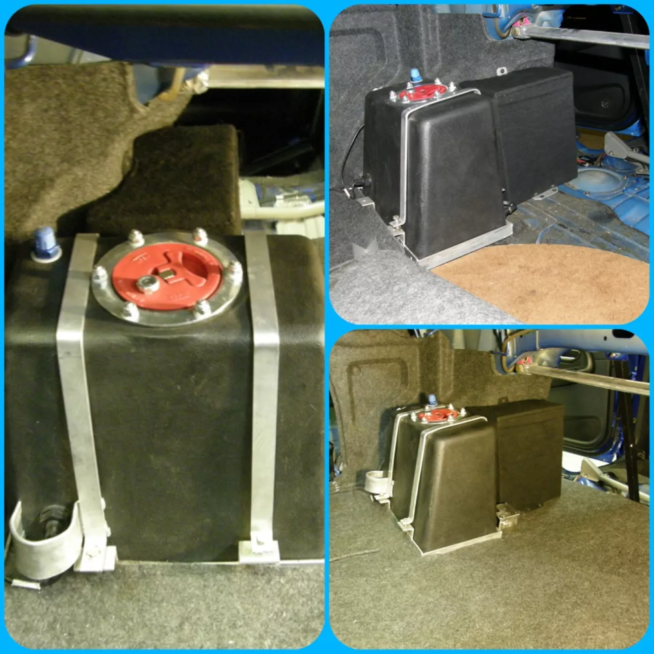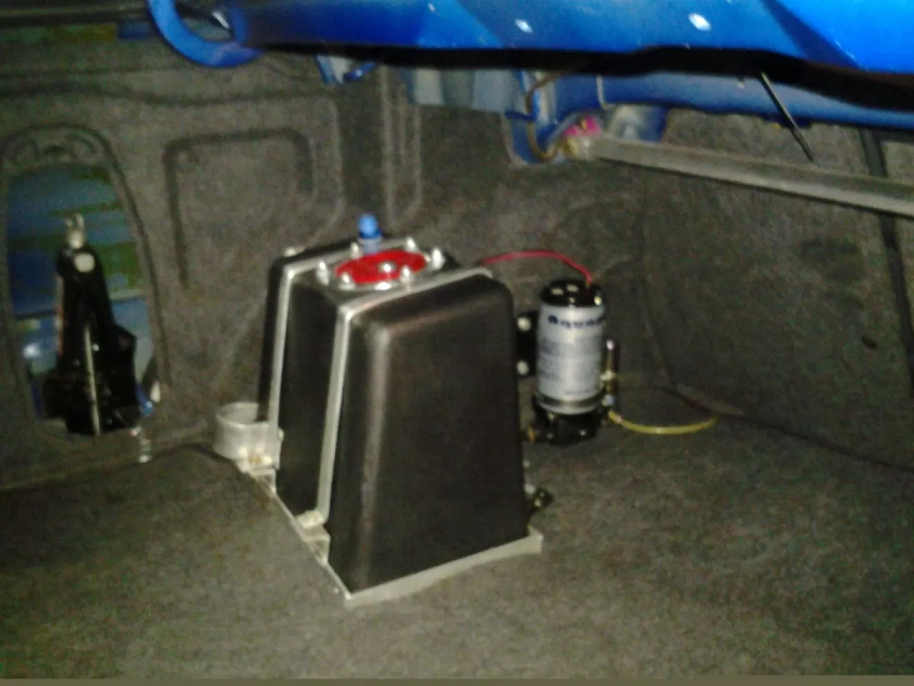 Бак был установлен в багажнике, за ним расположился насос. Позже, во избежание повреждений насоса Вова АТ Ралли сообразил коробочку, которая защищает насос. Выглядит все аккуратненько.
