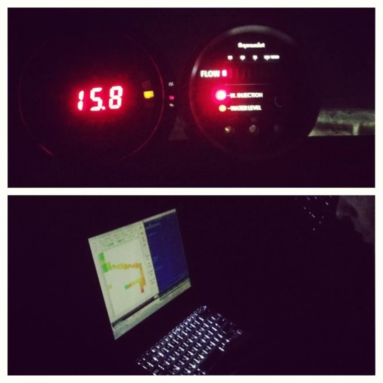 При использовании 50% смеси воды и метанола топливная смесь существенно изменилась, удалось сделать смесь около 12.1:1 против 11:1 на 100-м (98) бензине и выиграть несколько углов зажигания.