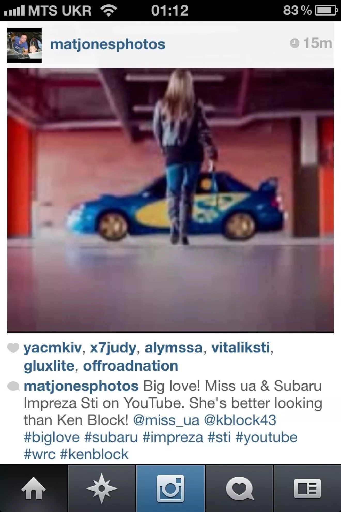 После того как в сети появилось мое видео, в инстаграме многие начали его постить, круто конечно, но очень веселым мне показалось то, как один иностранец его подписал :) Фраза из подписи : " She is better looking than Ken Block". Мне и смешно, и радостно в одно время :)