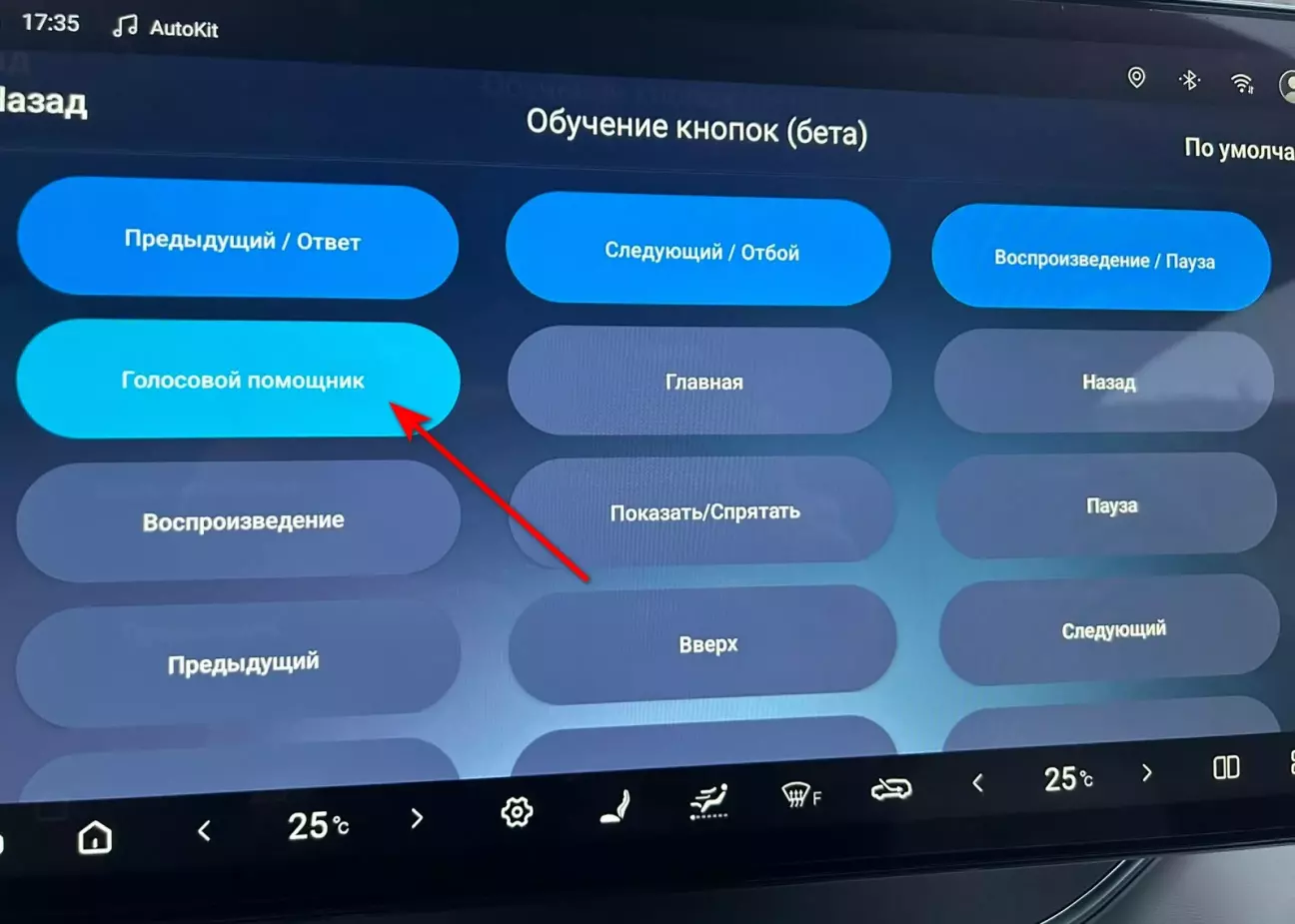 Далі потрібно активувати кнопку на кермі голосового помічника щоб при її натисканні був запит не на китайського голосового помічника а саме на голосового помічника Siri. Для цього потрібно вийти з додатку Autokit на планшеті, відключити інтернет, зайти знову в Autokit, потім в налаштування – розширені налаштування – ключове навчання (beta) – голосовий помічник і після натискання на вкладку «Голосовий помічник»