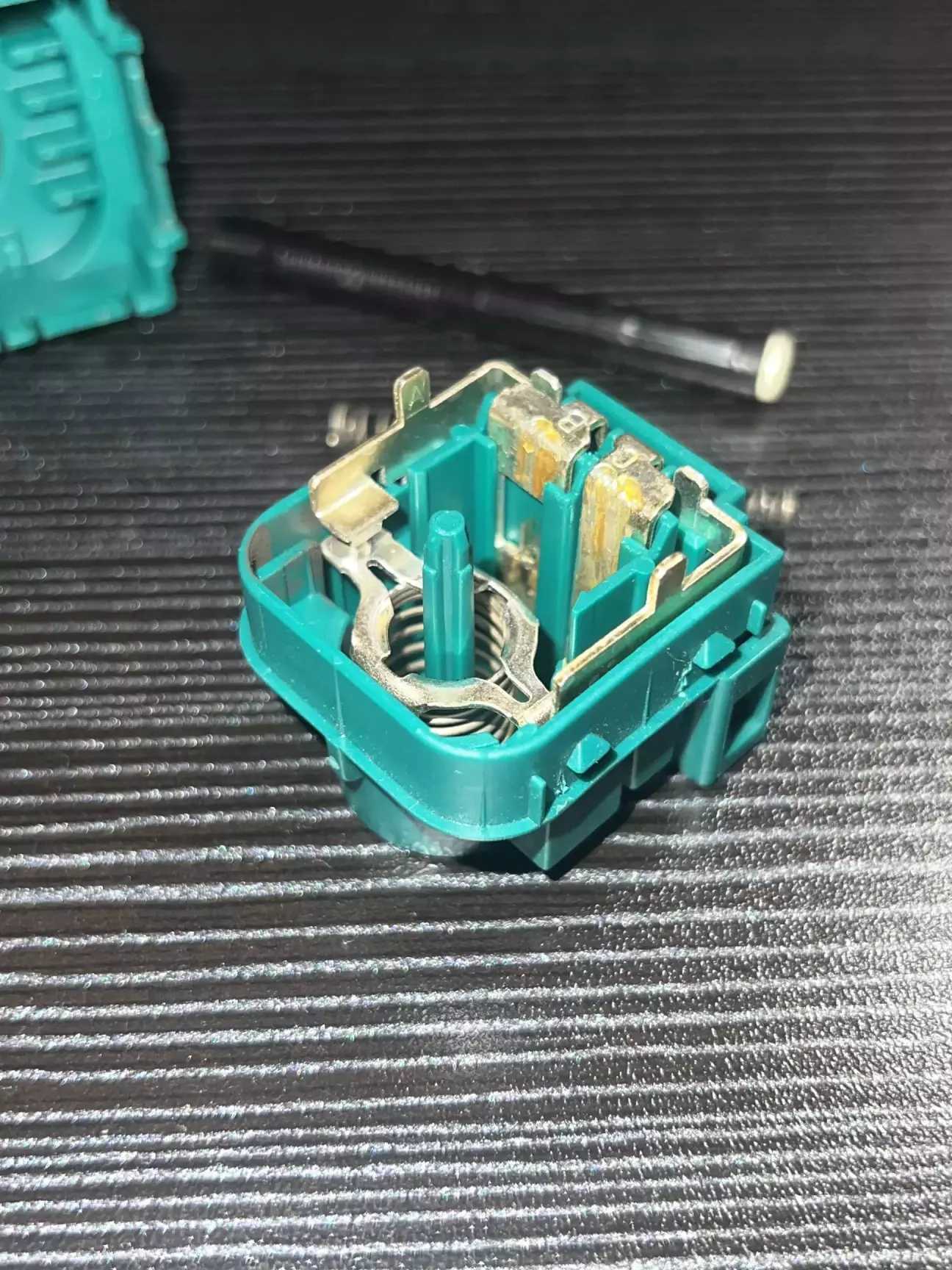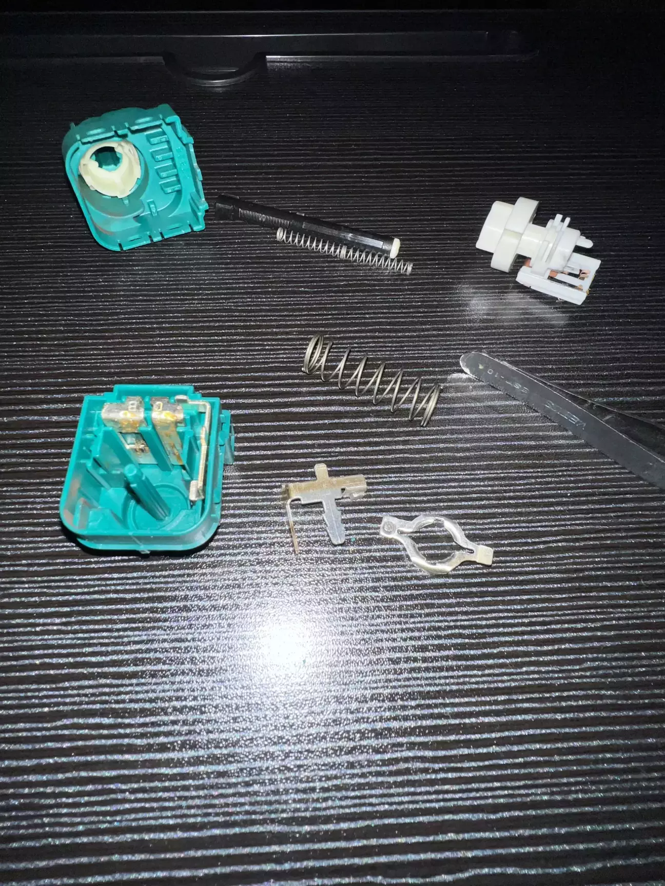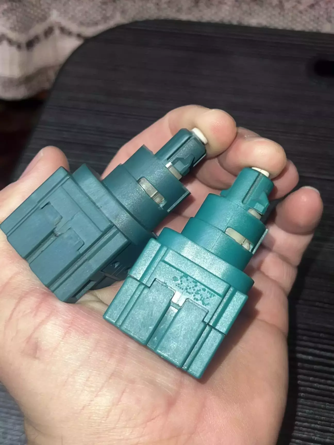 Короче кажучи ремонт був дуже швидким. Знявши цей вимикач, я відразу лізу його розбирати. Доречі оригінал коштує 700 грн. Розбирається він дуже легко, і відразу розсипається на деталі які я потів ледве зібрав, зрозумівши цей незрозумілий механізм…. Всередині я не знайшов нічого згорівшого, а просто підчистив два контакти які завжди замкнуті. І я так зрозумів що розмикаются вони коли тиснеш на педаль гальма. Під час збирання вже трохи почало мене бісити, я не міг зрозуміти чому коли штовхаєш чорний пластиковий шток, всередині 2 салазки не рухаються 🤷♂️ Думав що зібрав якось не правильно. Тому я знайшов другий такий вимикач, але не оригінал, і в нього такий ж самий принцип. Виявилось все просто, коли його встановлюєш в каркас над педаллю, на ньому трохи прокручується білий пластиковий фіксатор і тим самим він всередині чіпляється на зубчики штока. Короче, хитрий механізм. Не можу сказати для чого було його таким робити, можливо це звʼязано наприклад з тим самим круїзом. Він повинен правильно сигналізувати що педаль дійсно натискається 🤷♂️