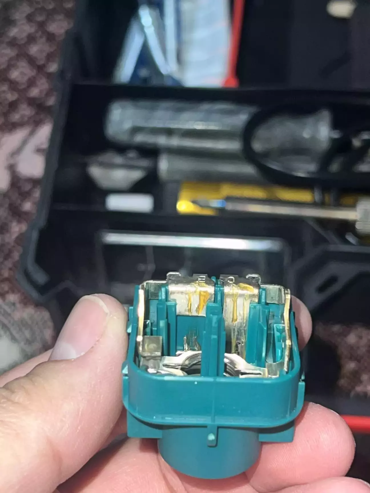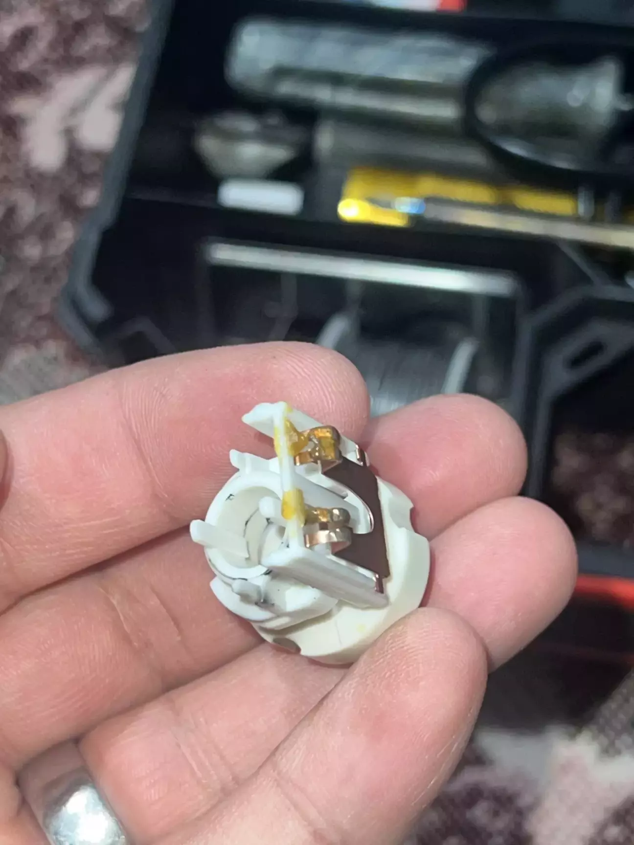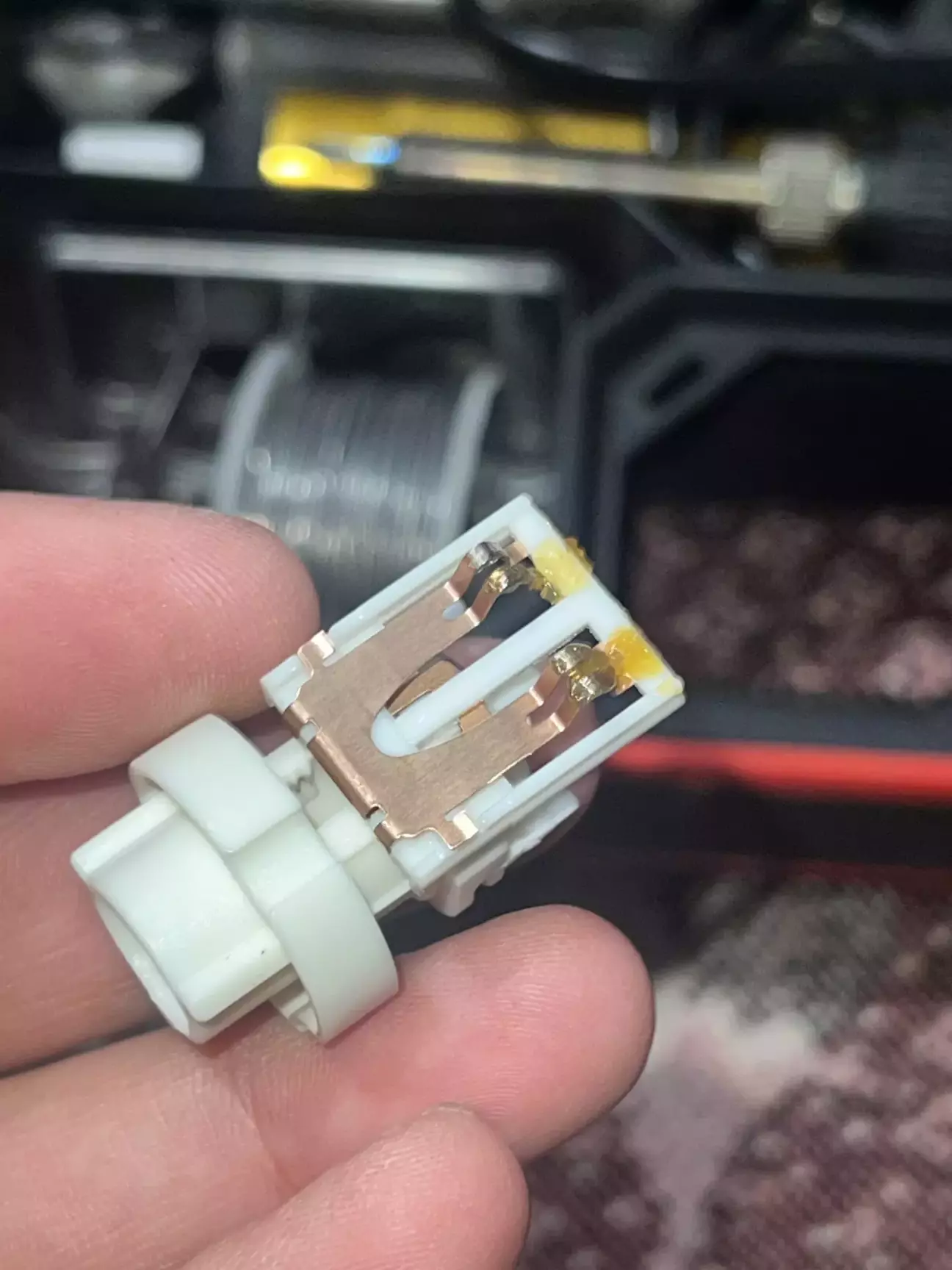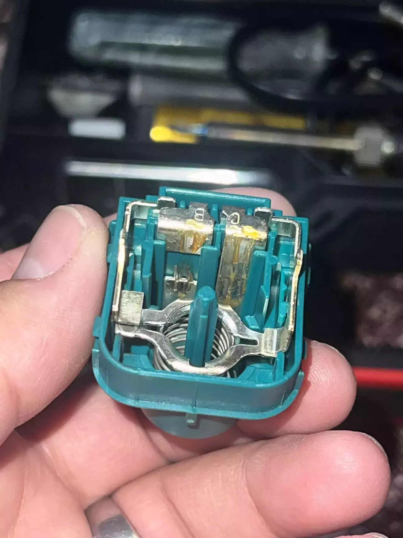 Короче кажучи ремонт був дуже швидким. Знявши цей вимикач, я відразу лізу його розбирати. Доречі оригінал коштує 700 грн. Розбирається він дуже легко, і відразу розсипається на деталі які я потів ледве зібрав, зрозумівши цей незрозумілий механізм…. Всередині я не знайшов нічого згорівшого, а просто підчистив два контакти які завжди замкнуті. І я так зрозумів що розмикаются вони коли тиснеш на педаль гальма. Під час збирання вже трохи почало мене бісити, я не міг зрозуміти чому коли штовхаєш чорний пластиковий шток, всередині 2 салазки не рухаються 🤷♂️ Думав що зібрав якось не правильно. Тому я знайшов другий такий вимикач, але не оригінал, і в нього такий ж самий принцип. Виявилось все просто, коли його встановлюєш в каркас над педаллю, на ньому трохи прокручується білий пластиковий фіксатор і тим самим він всередині чіпляється на зубчики штока. Короче, хитрий механізм. Не можу сказати для чого було його таким робити, можливо це звʼязано наприклад з тим самим круїзом. Він повинен правильно сигналізувати що педаль дійсно натискається 🤷♂️