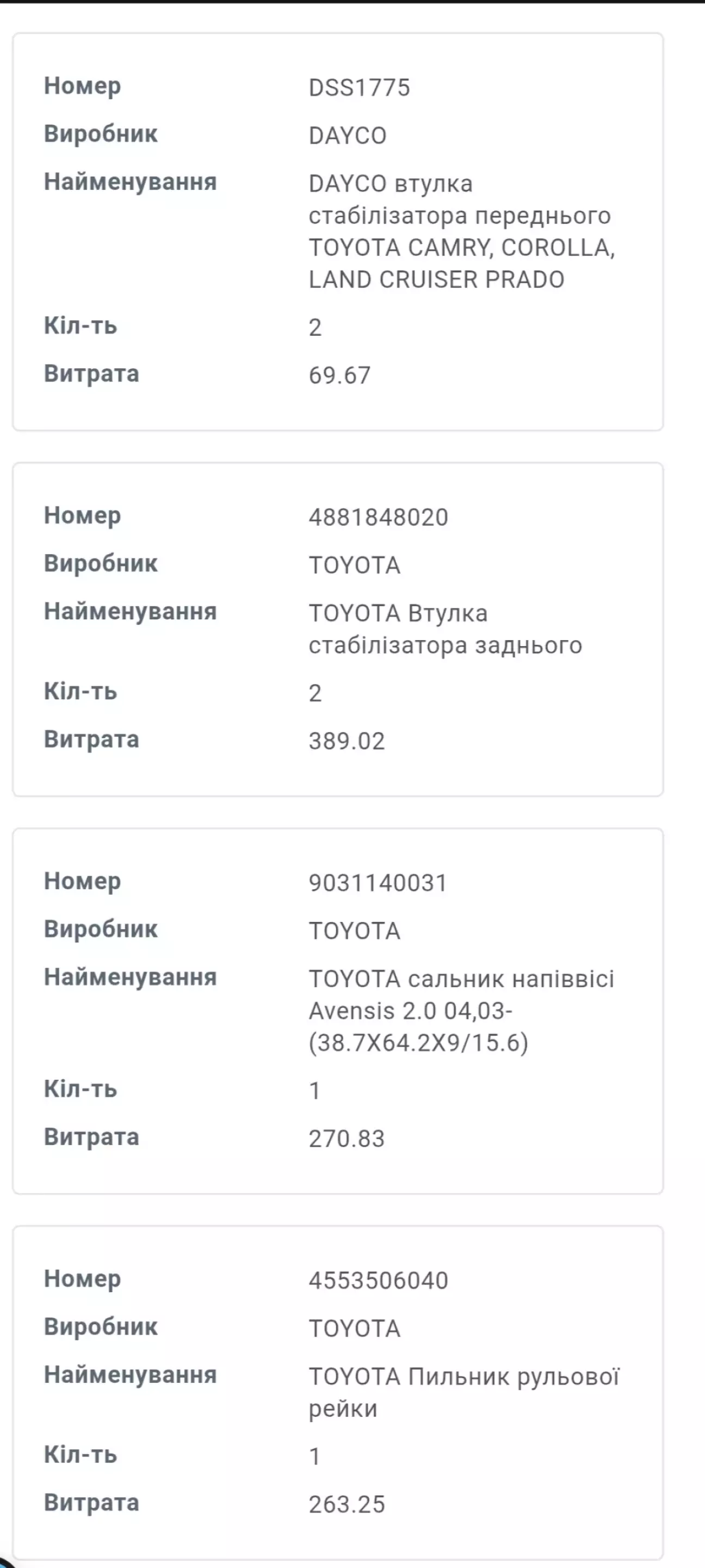 По грошах це вийшло: насос Bosch 1122 грн, клапан газового редуктору 3000 грн з роботою , прокладка клапанної кришки 630 грн (Elring), свічки 1523 грн за комплект (Denso), котушки запалювання комплект 3520 грн (Beru), втулки стабілізаторів передні 140 грн (Dayco) і задні 389 грн (Toyota), сальник пів-осі 270 грн (Toyota), пильник рульової рейки 263 грн (Toyota), водяна помпа 1156 грн (Aisin). В сумі 12013 грн, враховуючи скільки машині років то це взагалі ще нормально, при тому що свічки і котушки ще були живі і були замінені превентивно! Тобто фактично 7000 грн було витрачено на експлуатацію. Це дуже хороший показник , зараз питань взагалі ніяких немає, машинка їздить практично кожен день ! Тойота є тойота.