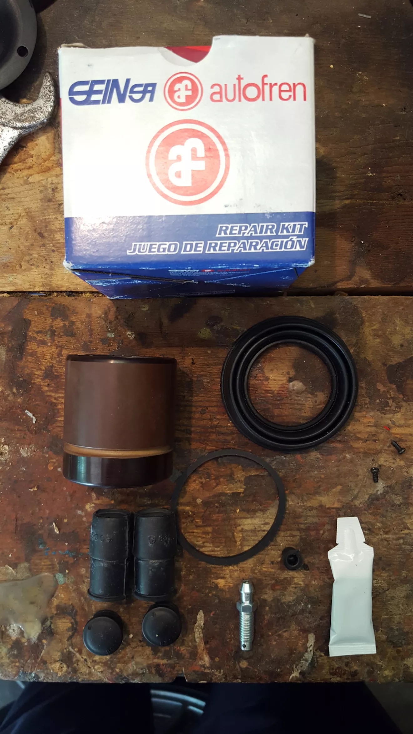 После замены тормозных дисков и колодок, решил еще сделать замену одного поршня так как в принципе он был уже и треснут да и видимо подклинивал та как туго ходил. Купил ремкомплект поршень не металл а какой то полимер. Манжет и сальник, когда разобрал там был капец ржавчина грязь. Все почистил собрал теперь всё четко … Сложного нет ничего … Ниже фото комплекта и самого старого поршня.
