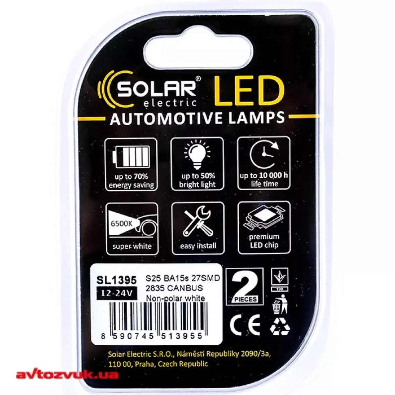 Працюють лампи SOLAR S25 BA15s 12-24V 27SMD 2835 CANBUS Non-Polar white SL1395 (2 шт.) від напруги 12-24 Вольт і універсально підходять для використання в легкових і вантажних транспортних засобах. Завдяки неймовірно білому світу з колірною температурою 6500 К лампи забезпечують чудову видимість навіть в яскравий, сонячний день і підвищують рівень безпеки під час руху по дорогах загального користування.
