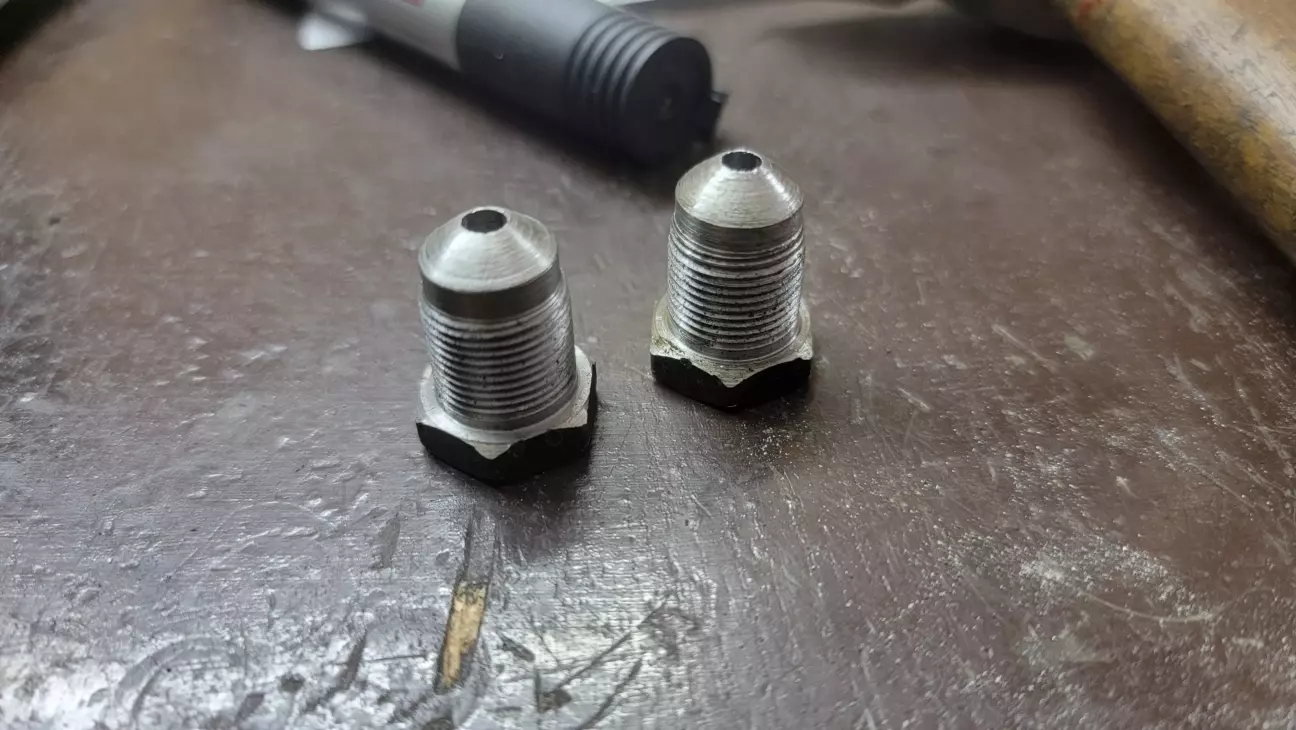 Батько зробив прекрасну роботу, що і конуса добре прилягають, і у майбутньому це діло тиск витримує добре. Для цього діла треба було докупити плашку на М14х1, та мітчики на М10х1 2-й та 3-й заход. В ідеалі було б знайти комплект мітчиків і з першим заходом, але таких я не знайшов. У принципі і цього було достатньо.