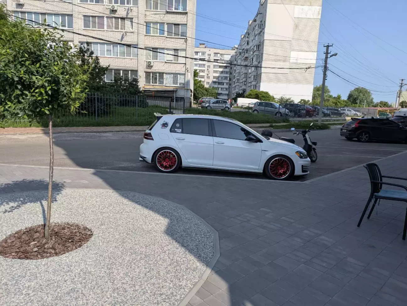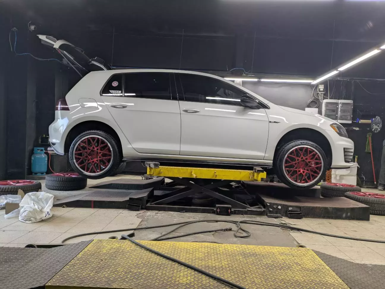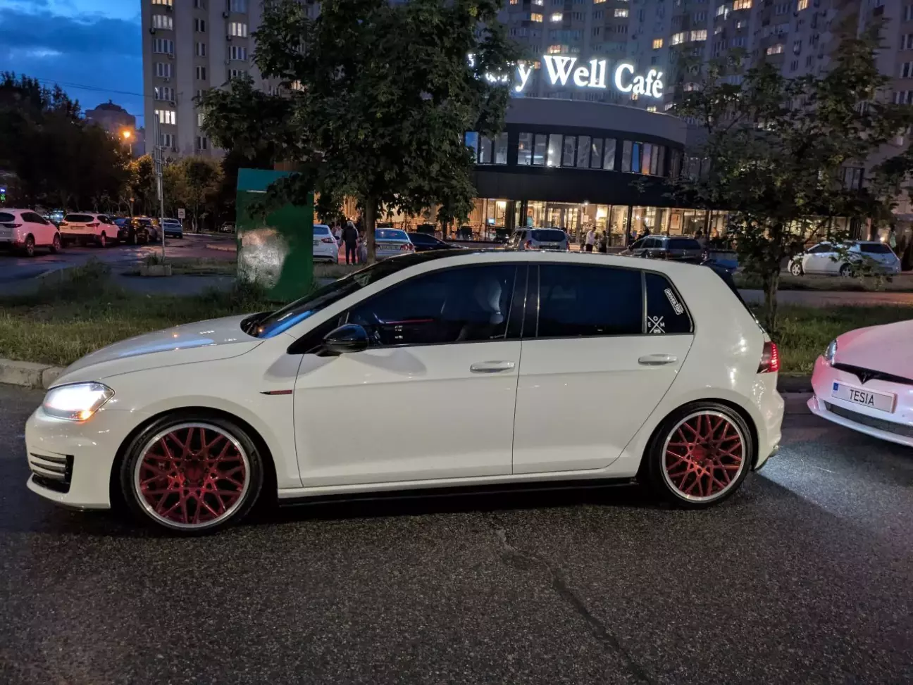 Одразу скажу, що білий колір це дуже гарно і дуже проблематично в плані його експлуатації і нагляду за ним). Так як машина і її оформлення залишається в основних трьох кольорах (білий/чорний/червоний), питання в який колір перефарбувати відпав одразу). Всі роботи як зазвичай робив з "Superwheels". Колір вибраний червоний кенді, з проточкою канта. Проведено роботи по рехтовці та підварці. Також оновлено колір супортів в "червоний порш", змінений штатний заводський сірий колір напису на білий та збільшено розмір самого лого (6500 грн).