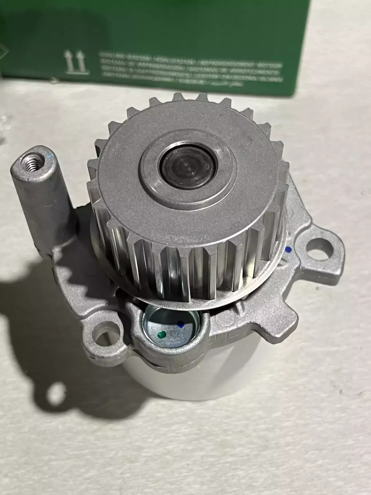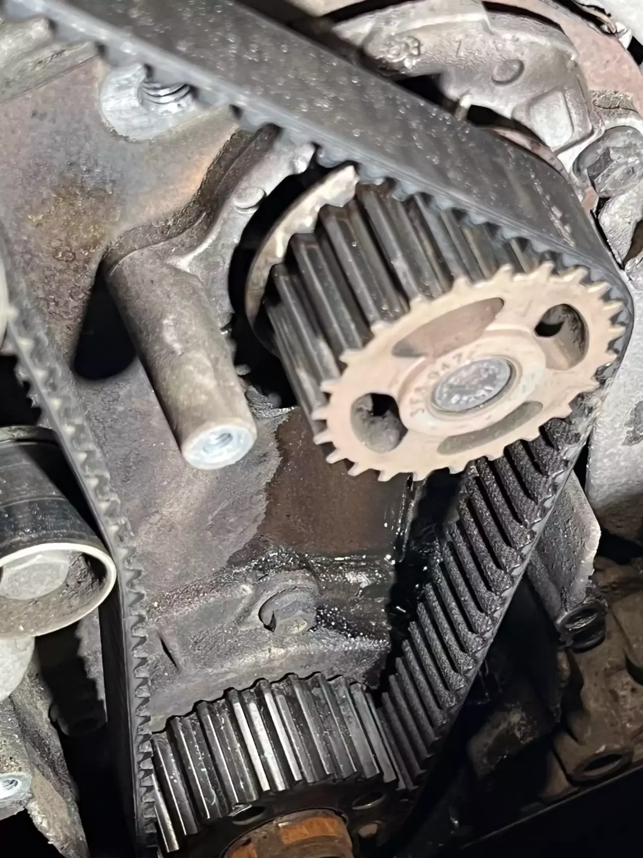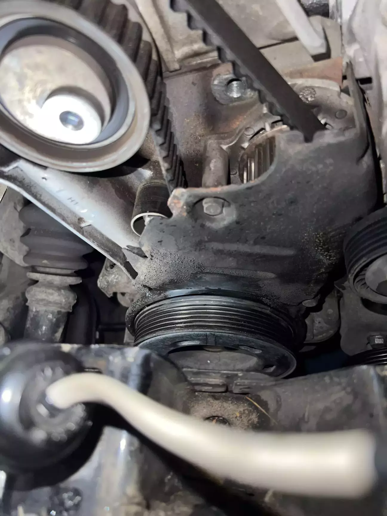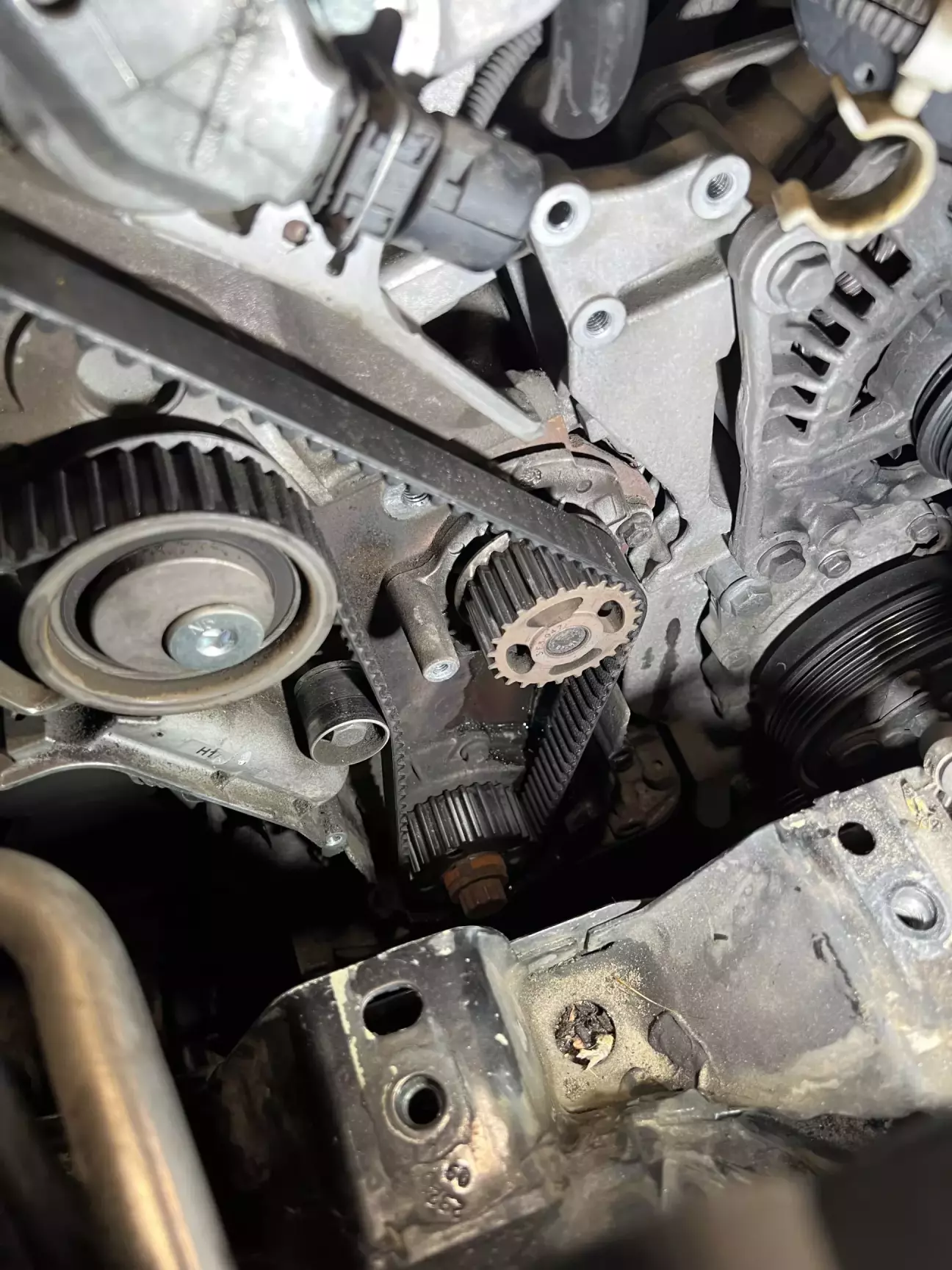 Подивившись трохи мануалу, замовляю ГРМ, помпу, нову оливу, концентрат антифризу Hepu та приступаю до розборки. Як виявилось взагалі нічого важкого 😎 Знайшов мітки які вже до мене були помічені білим маркером, відчистив від бруду, та декілька разів прокрутив колінвал щоб впевнитись що все виставлено чітко 👌 Закрутивши болт м5 в натягувач щоб прослабити ремінь, все знімаю. І бачу як з під помпи антифриз тече рікою. Як виявилось пізніше потекла не сама помпа а її резинове кільце 🤔 Виробника я встановити не зміг, ні назви ні цифр… Крильчатка металева, не INA точно. Але пройшла більше 70 тисяч. Не знаю багато це чи мало… 🤷♂️