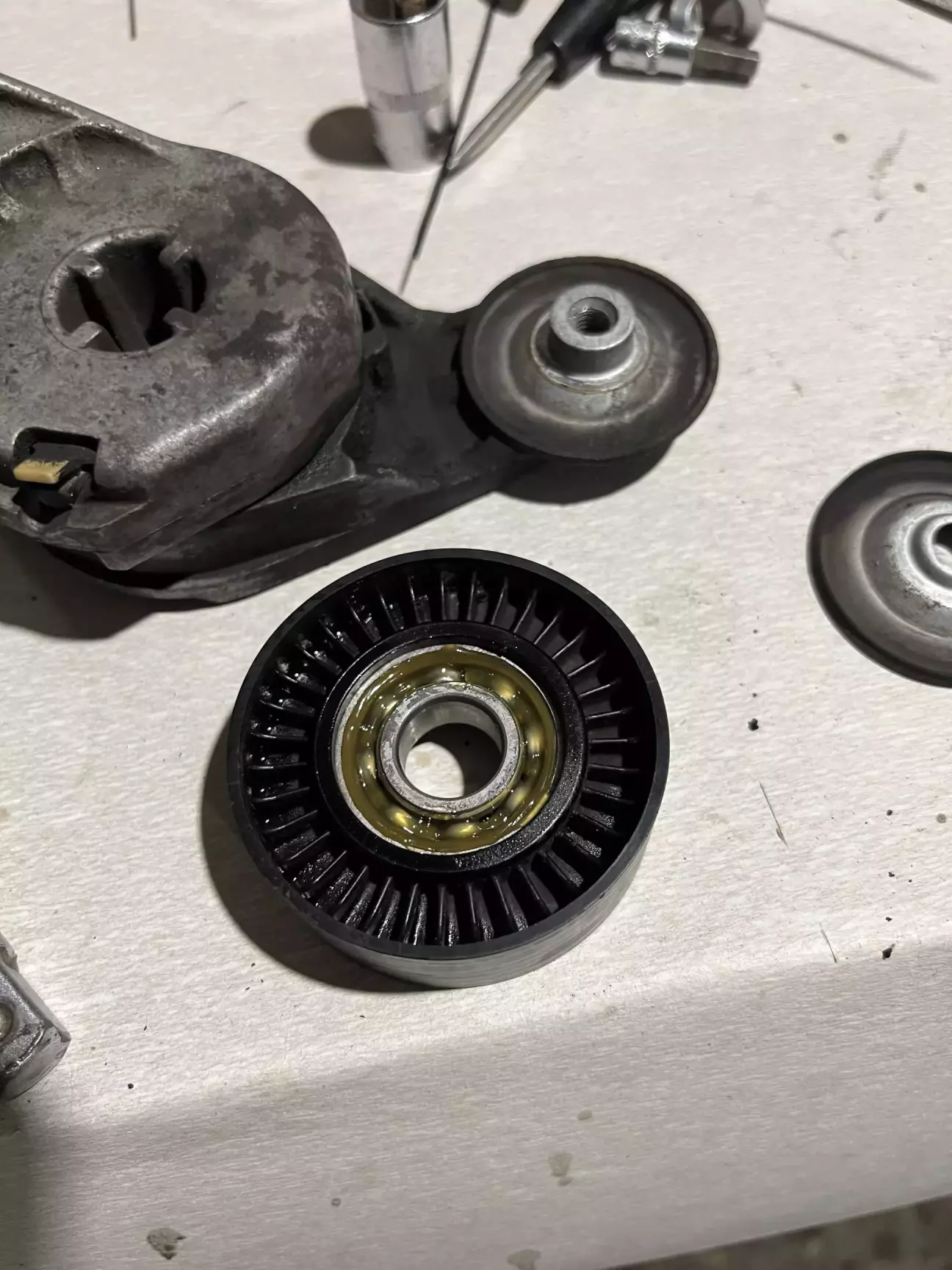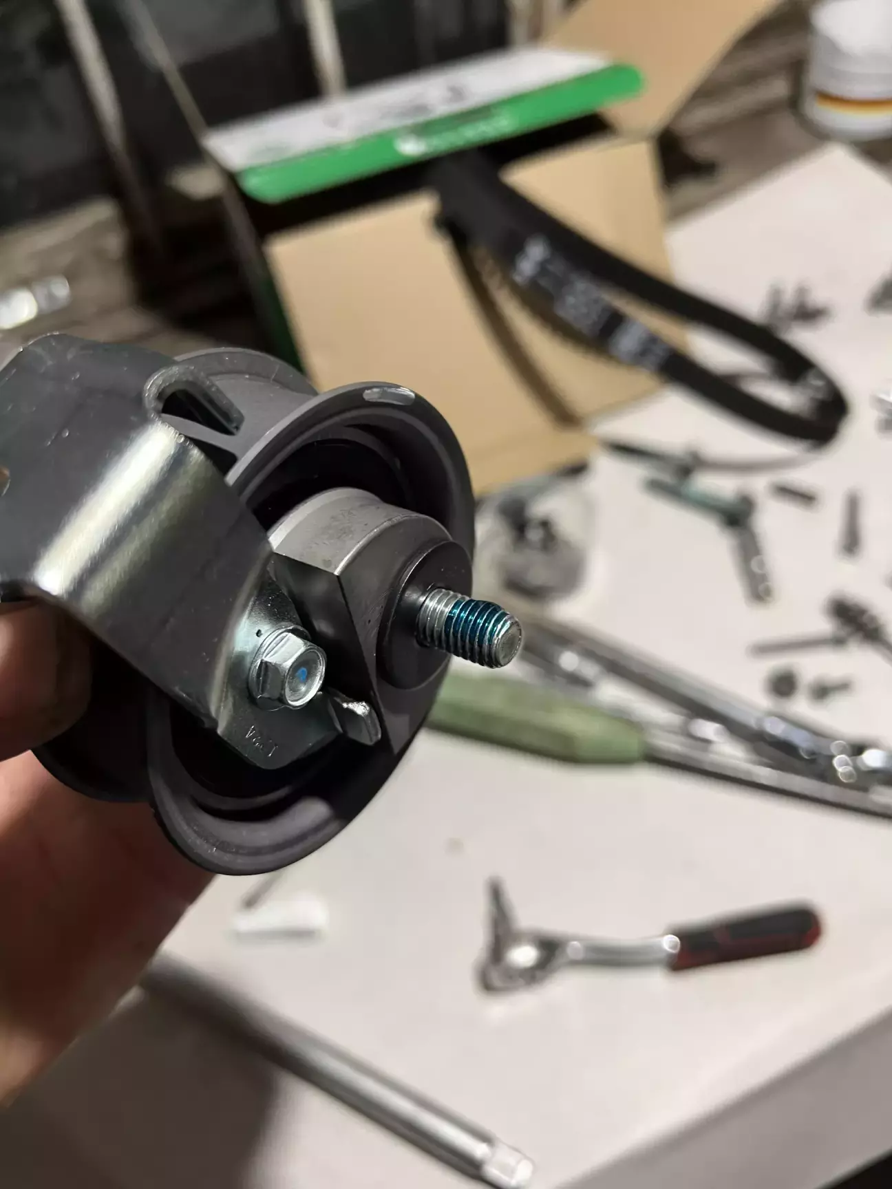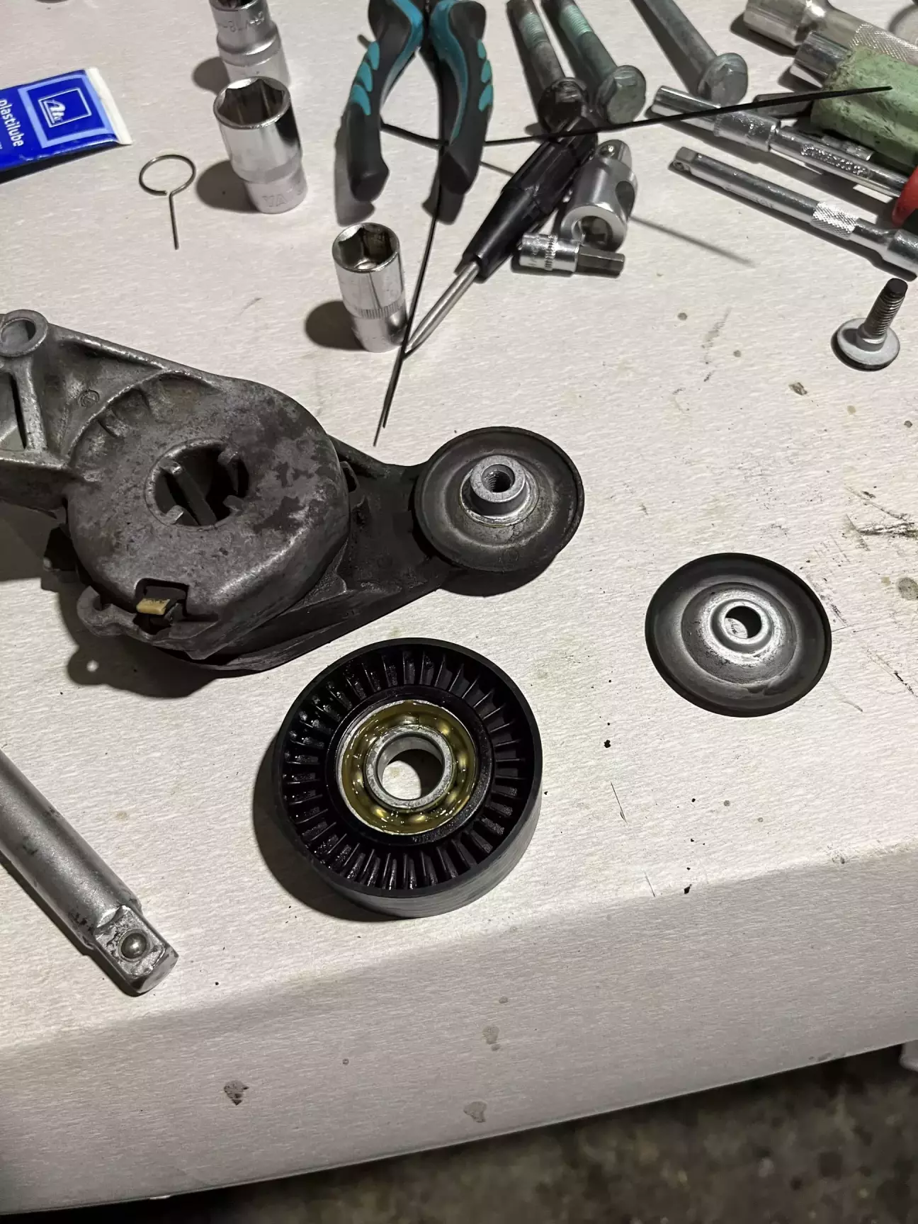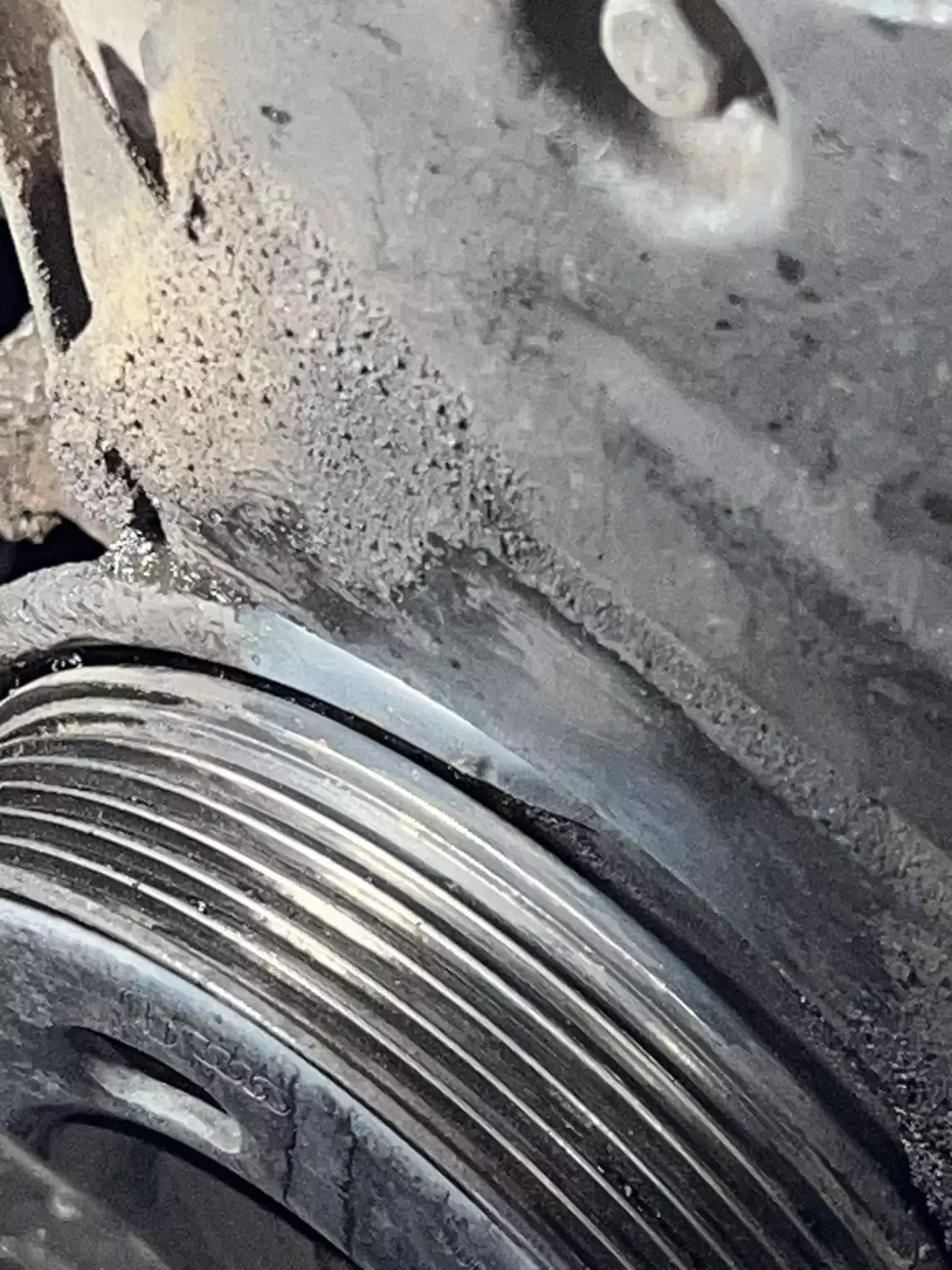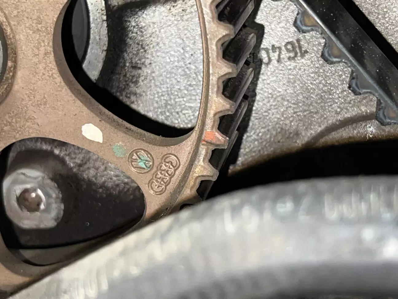 Подивившись трохи мануалу, замовляю ГРМ, помпу, нову оливу, концентрат антифризу Hepu та приступаю до розборки. Як виявилось взагалі нічого важкого 😎 Знайшов мітки які вже до мене були помічені білим маркером, відчистив від бруду, та декілька разів прокрутив колінвал щоб впевнитись що все виставлено чітко 👌 Закрутивши болт м5 в натягувач щоб прослабити ремінь, все знімаю. І бачу як з під помпи антифриз тече рікою. Як виявилось пізніше потекла не сама помпа а її резинове кільце 🤔 Виробника я встановити не зміг, ні назви ні цифр… Крильчатка металева, не INA точно. Але пройшла більше 70 тисяч. Не знаю багато це чи мало… 🤷♂️