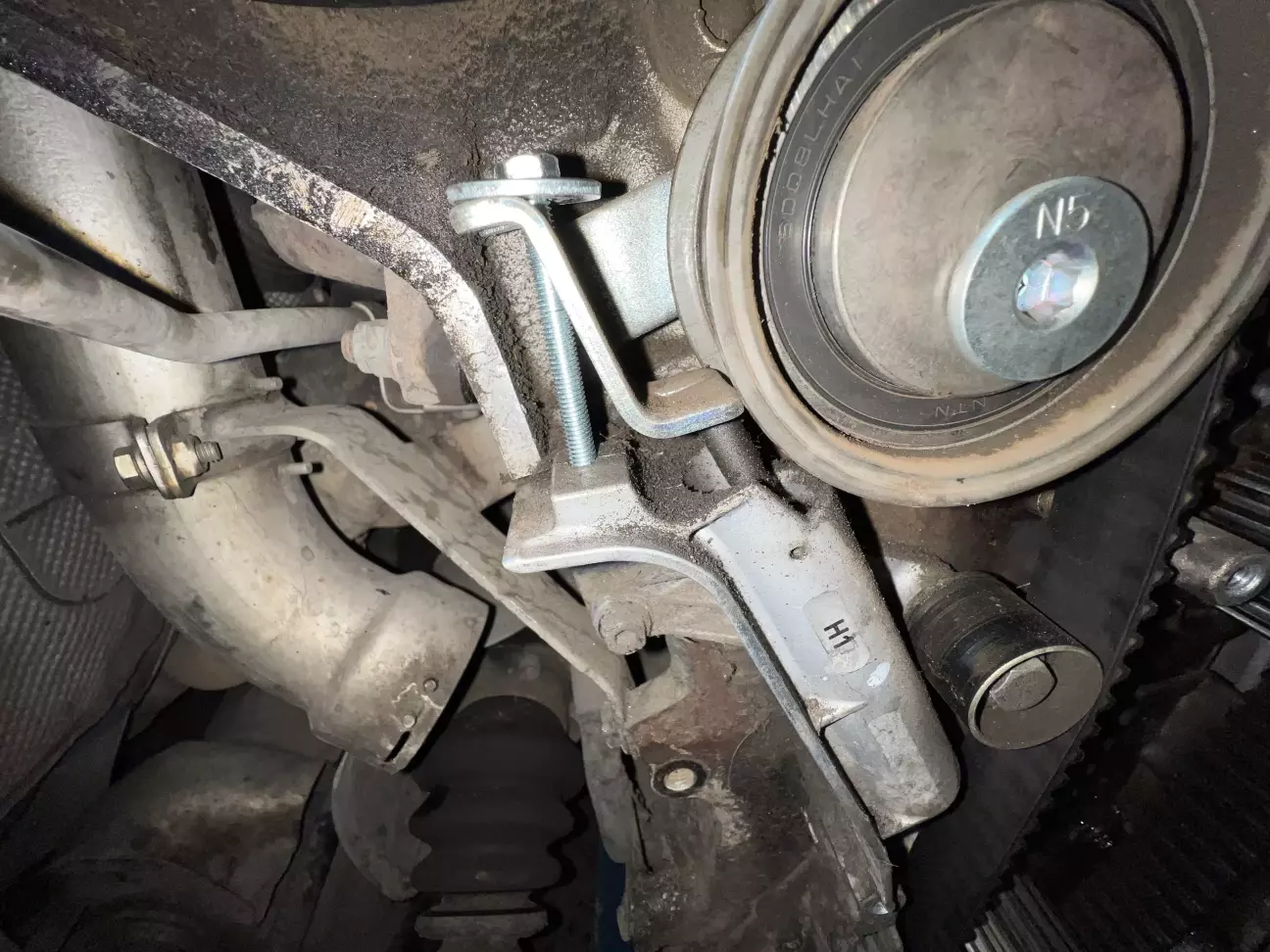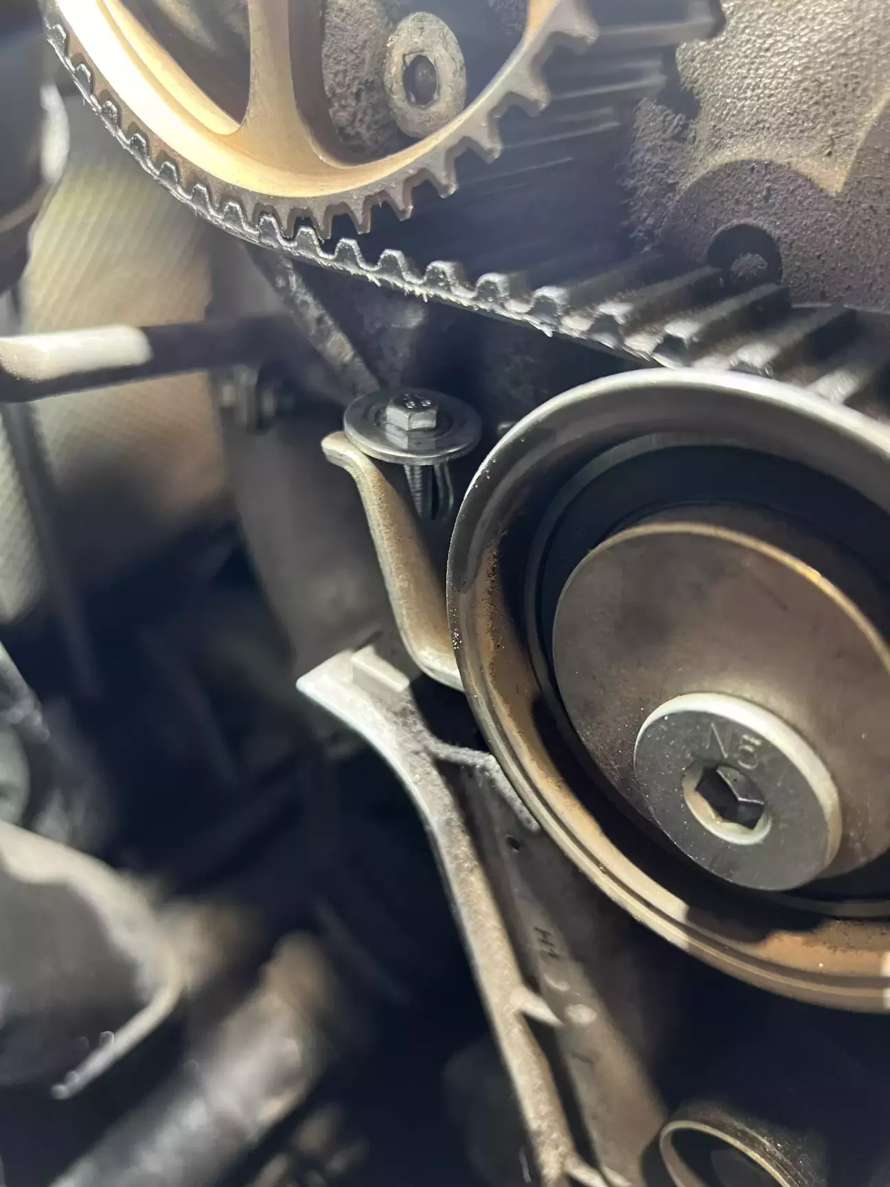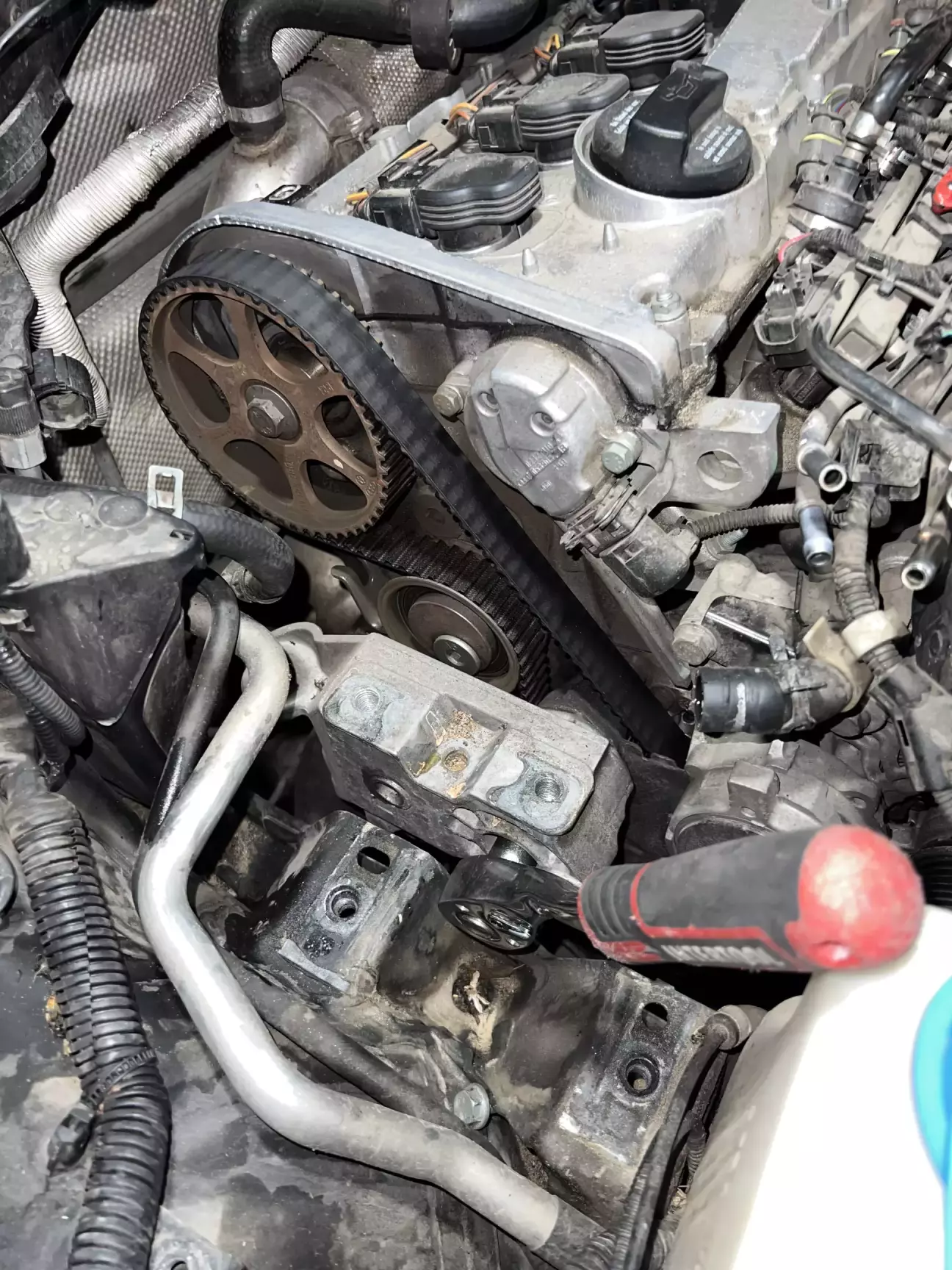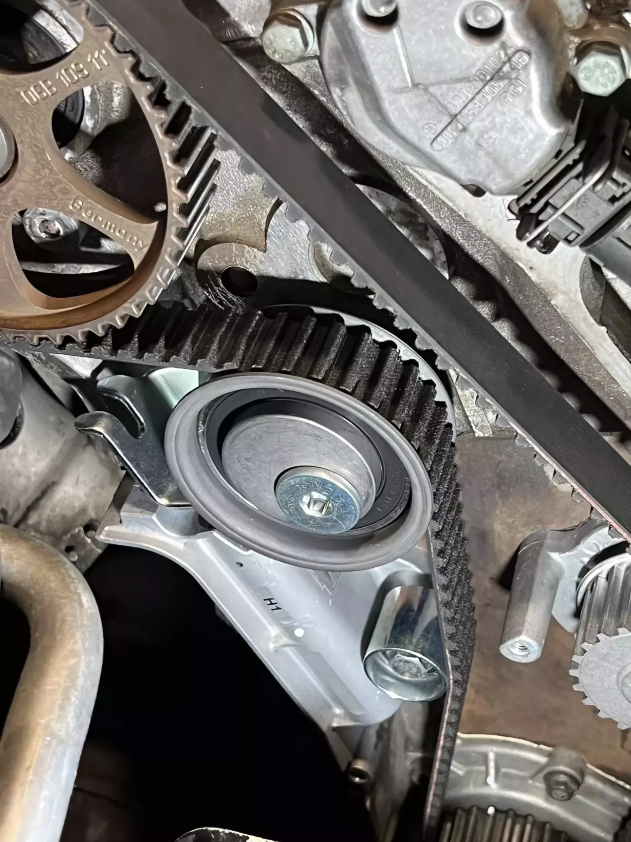 Перед встановленням нового ременя ГРМ, розпредвали та колінвал можуть трохи прокручуватись, тому я їх підкрутив, виставивши ідеально по міткам 😎 Візьміть до уваги якщо що 😁 Накидуємо ремінь з початку на колінвал а потім на шестерню розпредвала. Так зручніше. Встановити новий ролик вдається тільки після встановлення самого ременя. Інакше не натягнется. Потім прокрутив раз 6 колінвал, впевнився на 200% що виставив все чітко👌 Тут я не хотів ризикувати 😃 І витягнув кільце з натягувача. В ролик який натягує ремінь генератора заклав трохи мастила, бо він вже трохи зашуршав…. 😑😑😑 Згоден, треба його також поміняти…
