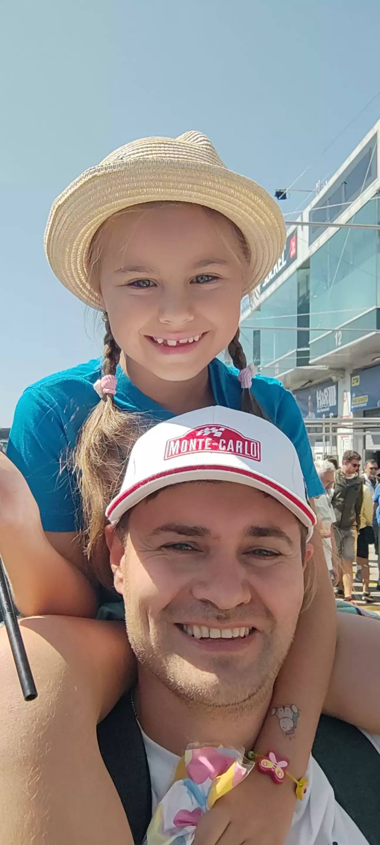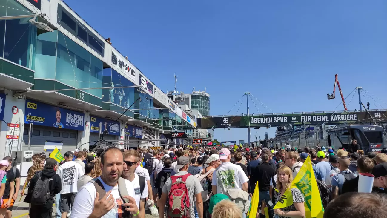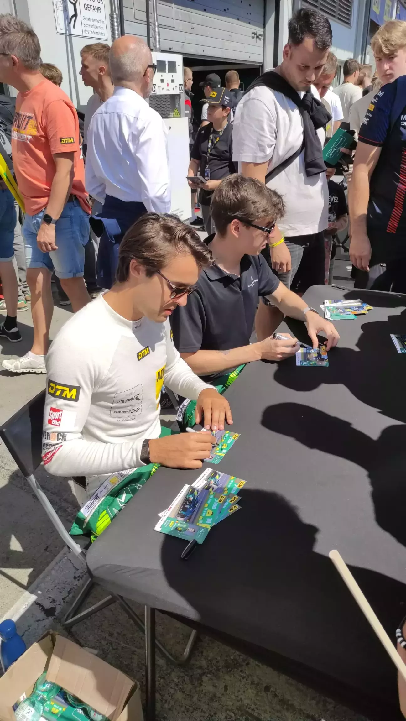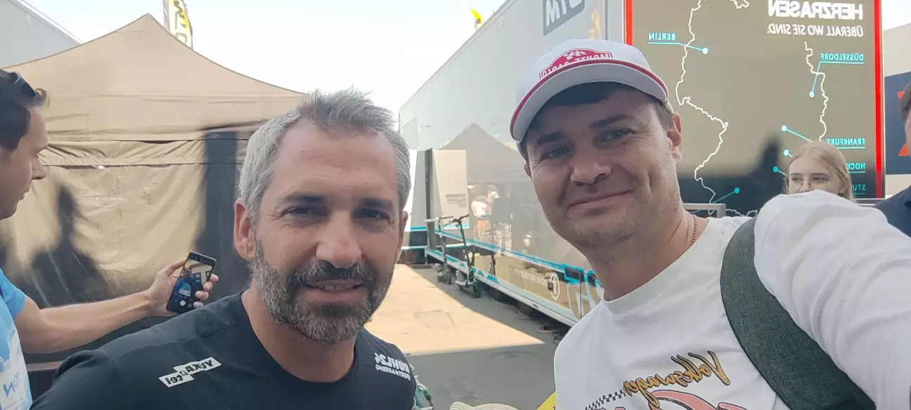 Після цієї гонки на треку була пауза, якою ми скористалися, щоб відвідати пітлейн та фан-зону, а також взяти автографи в гонщиків. Мені пощастило в потрібний час бути в потрібному місці, щоб зробити селфі з єдиним гонщиком DTM, якого я знаю - Тімо Глок виступав у Формулі 1 з 2004го по 2012й роки за команди Джордан, Тойота та Вірджин. Не надто успішний (лише 2х 2ге місце та 1х 3тє, а ще 1х найшвидше коло), проте єдиний гонщик Ф1, якою я цікавлюся вже майже 30 років (дякую безкоштовним трансляціям на укрТБ в 90х). Пощастило тому, що я його підловив біля командного траку, коли пітлейн ще був закритий. Коли ж його відкрили, то таке враження, що туди ринулася половина глядачів одночасно))) В кращих традиціях київського чи харківського метро в годину-пік затиснутий між іншими людьми ти намагаєшся тримати власний курс))) Звісно, тут я донечку закинув на плечі, бо травмувати дитину тут дуже просто...