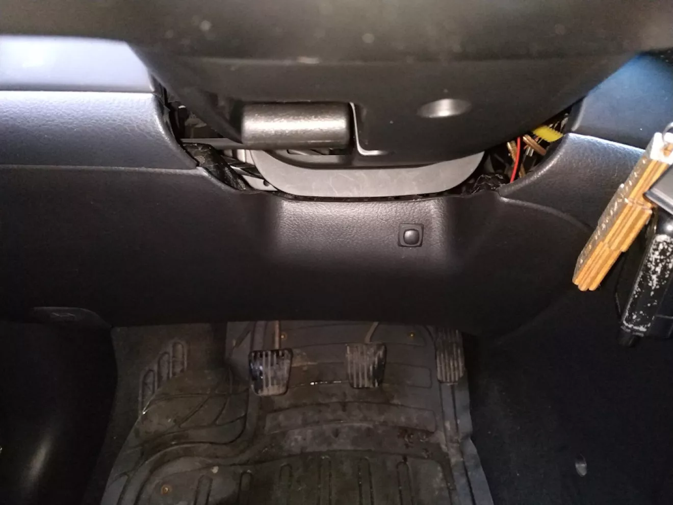 Кнопки не видно, нажимать удобно, и установить было удобно, так как панель под рулем крепится только на защелках и легко снимается.