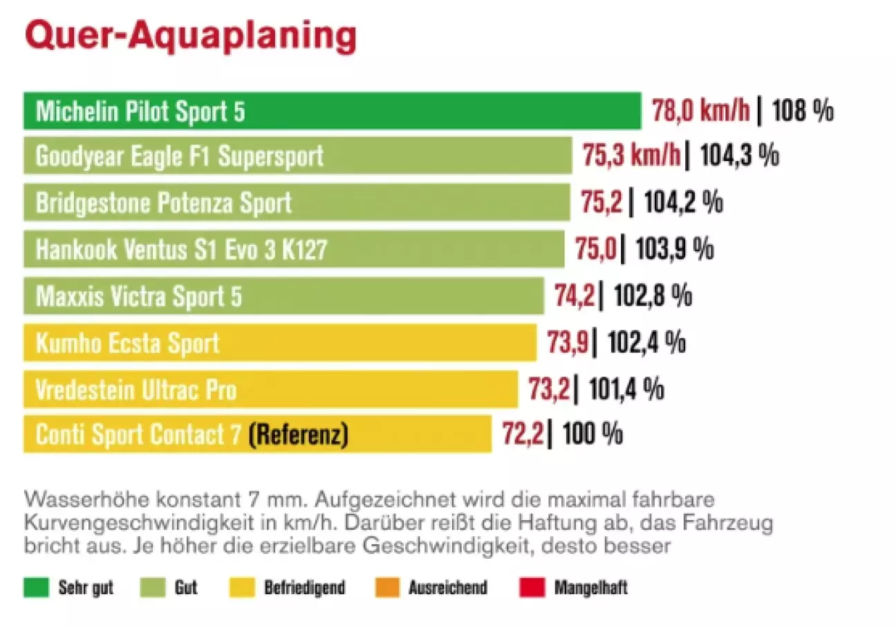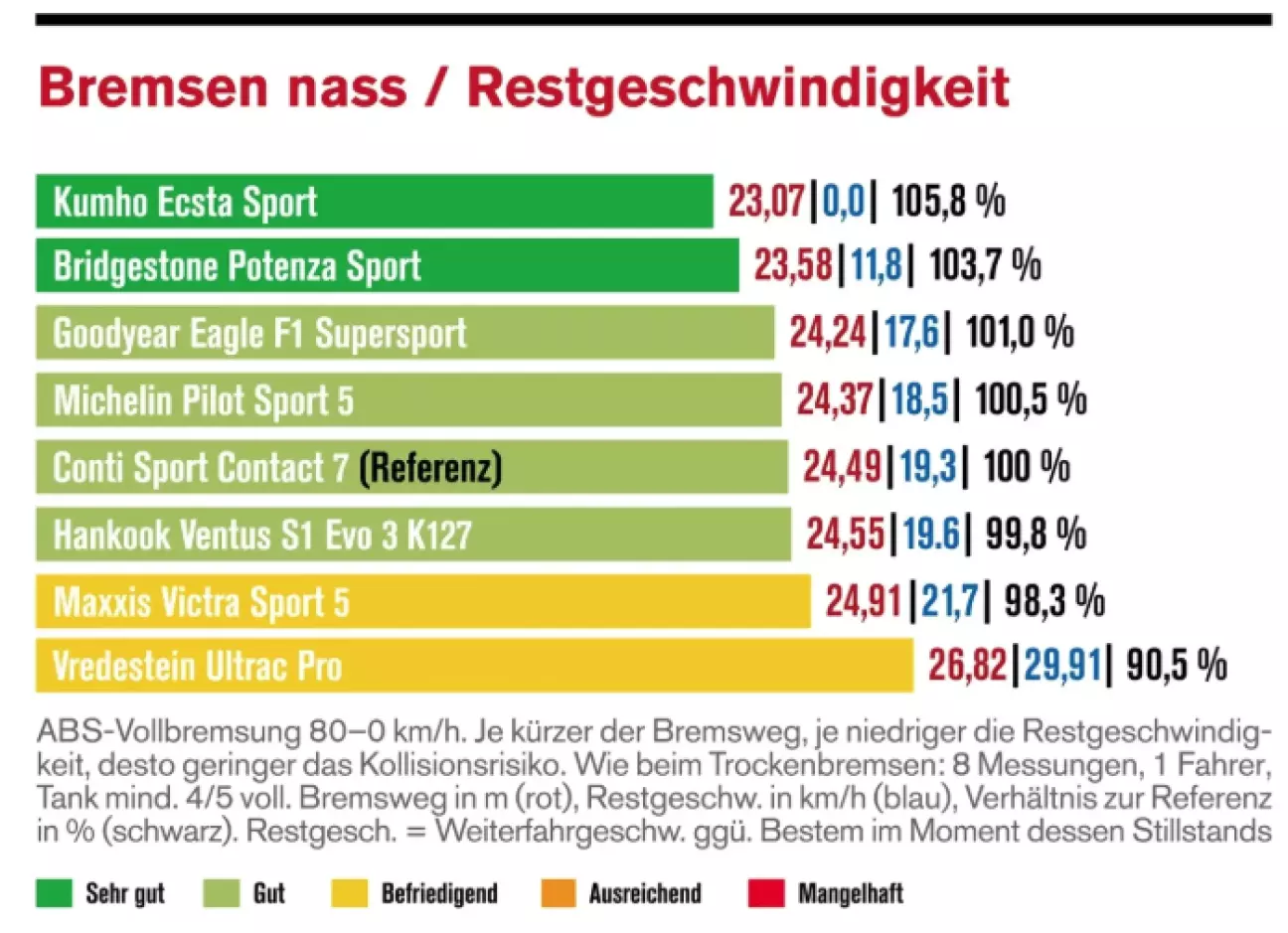"Та ні, Conti зупиняється на 24,5 м — це середній результат, і він поступається конкурентам: Michelin (24,4 м), Goodyear (24,2 м), Bridgestone (23,6 м) та Kumho (23,1 м). Що? Але дані вимірювань однозначні. Пікантна деталь: поки Kumho, несподіваний лідер у гальмуванні на мокрому покритті, вже повністю зупинився, Conti у цей момент ще рухається зі швидкістю 19,1 км/год. І це досить багато. Hankook і Maxxis також не вражають, а Vredestein з результатом 26,8 м або майже 30 км/год залишкової швидкості займає останнє місце."