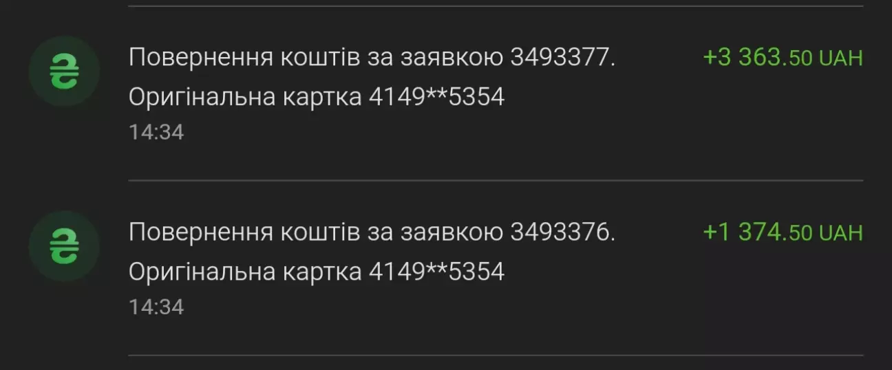 "Заявку на повернення коштів подано. Ми візьмемо її в роботу найближчим часом. Зазвичай розгляд відбувається протягом 45–120 днів. За результатами надішлемо вам сповіщення через один із каналів інформування. "