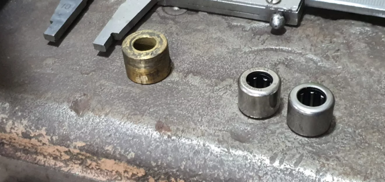 Исходя из болтов было понятно что в один мотор уже "лазили" и по фото видно что одна втулка уже латунная( с небольшой выработкой ), вторая родная, но выработка ого-го… Подшипники были так себе… Вернее один уже клинил, второй крутился но "звуки" подшипник уже подавал… Пообщавшись с продавцами запчастей принял решение просить помощи токаря ( как один из варианта решения вопроса)… Точить такую же латунную втулку, но две сразу или подшипник вместо втулки! В магазине подшипников продавец по размерам 8×16.5 сказал что есть 8×16 но под заказ, однако токарь меня остановил что размер переходной втулки "ни о чем" — качество в 0! Тогда из всего что есть в наличии было принято решение взять игольчатые подшипники 8×12… Токарь одобрил и все оплачено и едем к токарю со всеми "бебихами" для переделки …