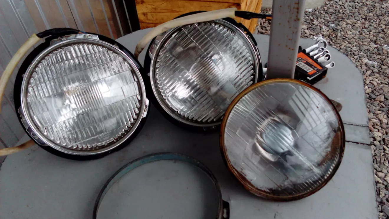 …была мутной и разной. В левом отражателей частично осыпалось зеркало. Да ещё и нить ближнего перегорела в лампочке. А у меня в запасах совершенно случайно завалялась пара новых фар от газона ещё советской эпохи. Даже с лампами в комплекте.