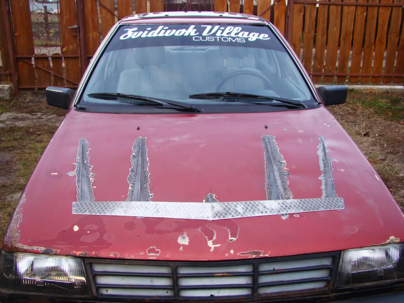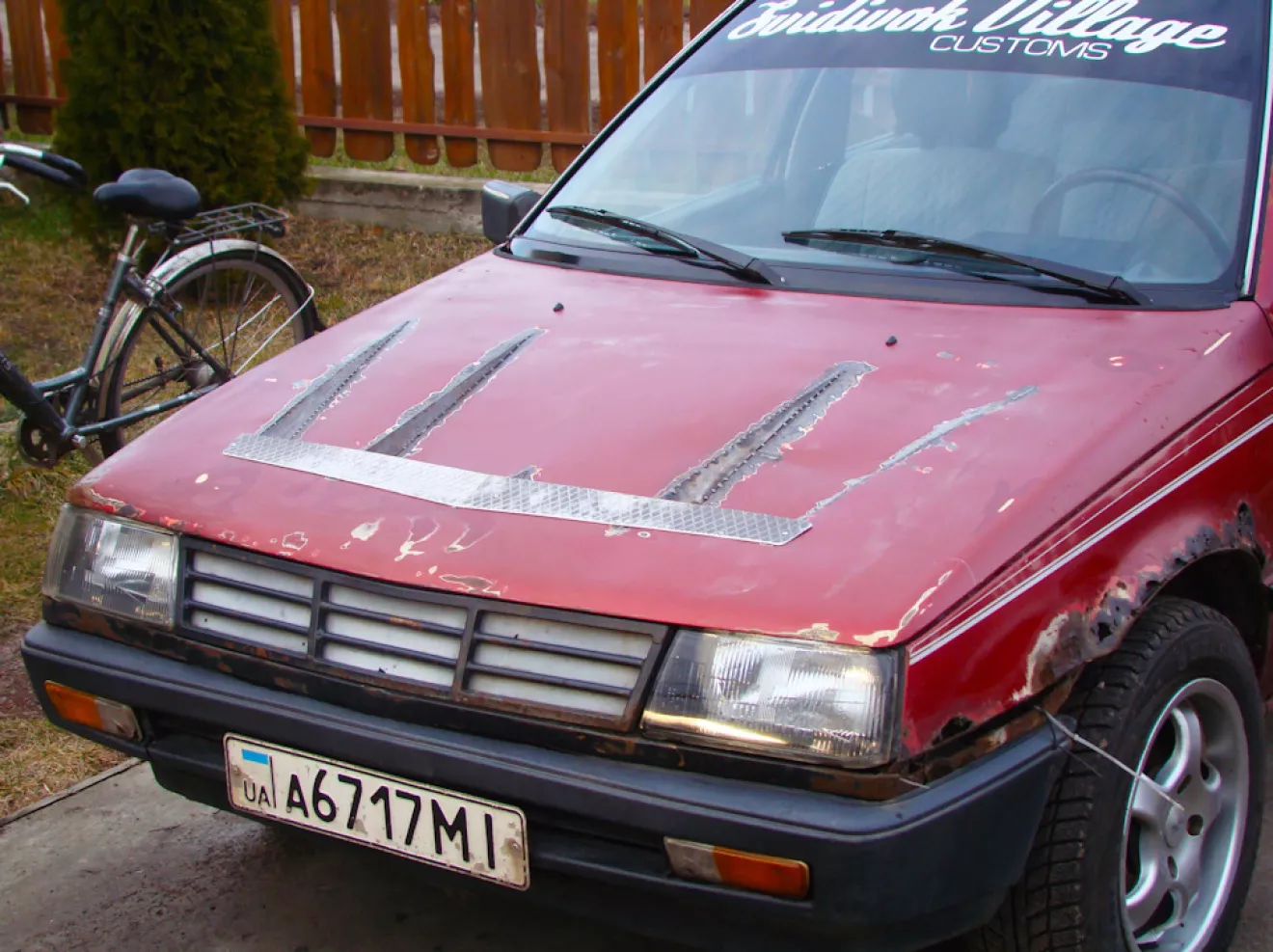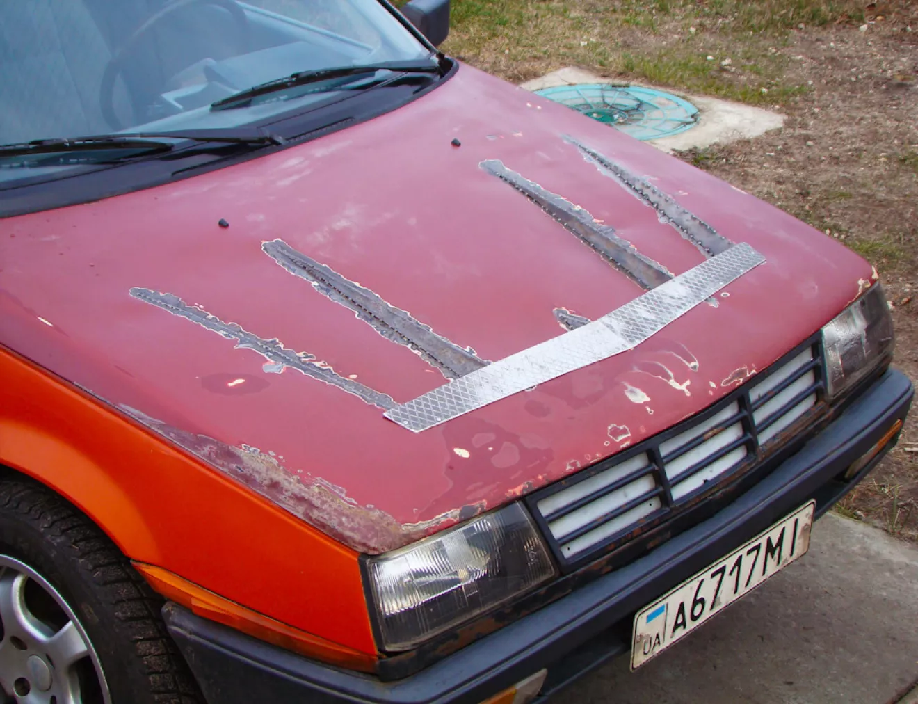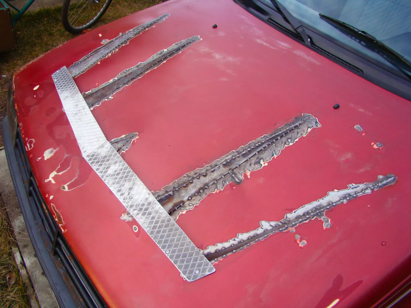 Так капот и простоял пол года. А я поглядывал на него, сначала с тоской, постепенно привыкая к его волнистым поверхностям. Потом капот мне стал в таком виде даже чем-то симпатичен. Взбрызнул его матовым лаком, добавил немного заклепок и алюминия. И вот что получилось.