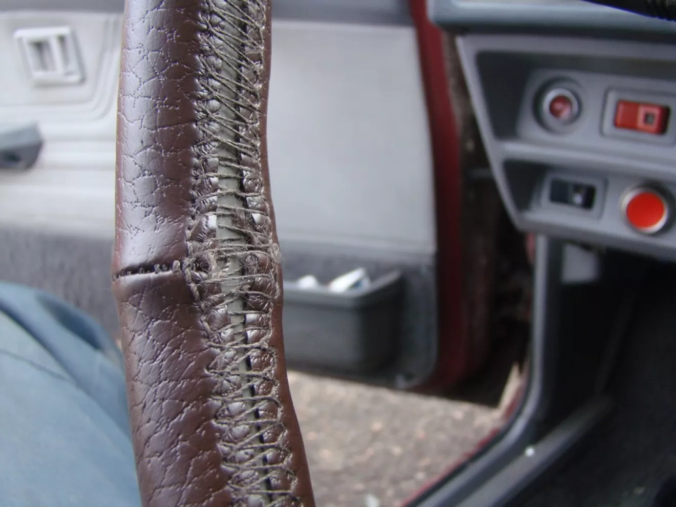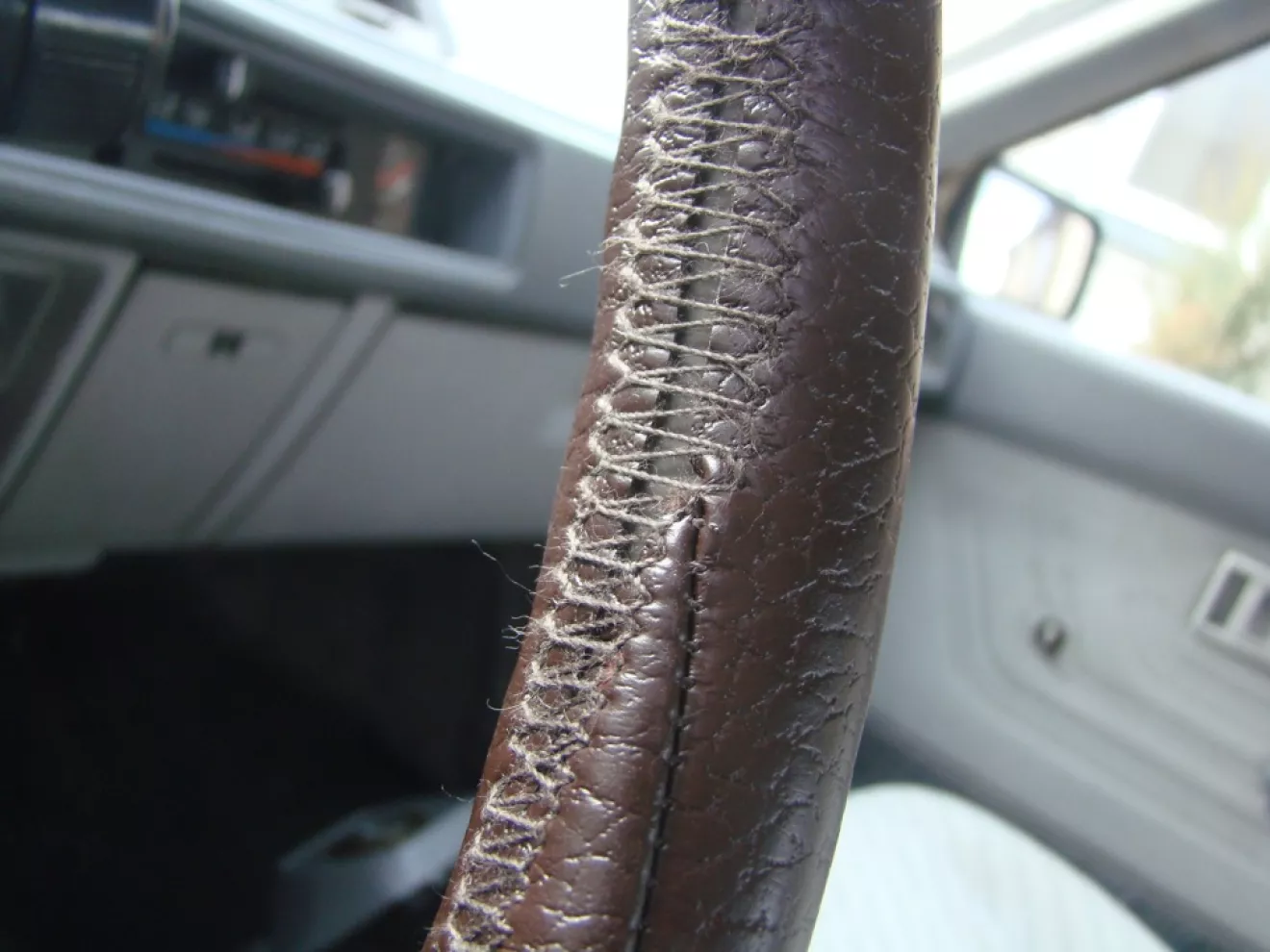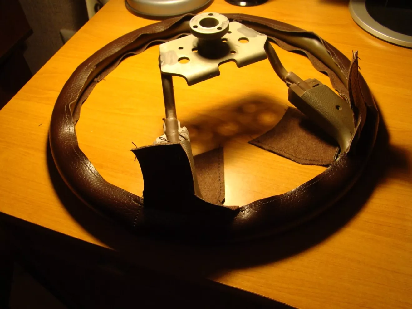 Наверное из-за старости материал руля стал липкий и неприятный. Когда машиной не пользуюсь пару дней, потом сажусь за руль — а он как вареньем намазан. "Це мерзость"! Одеть базарную насадку на член руль — мне не позволяет мое пуританское воспитание. Насмотревшись в интернетике, как легко и просто люди перешивают рули, решил попробовать тоже. Хорошо, был в запасе тренировочный руль. Купил мебельного кожзама, но почему-то мало. Жадный наверное стал с годами. Полоску всего 10 см шириной. Руль то тонкий, подумал я. Но не учел две перемычки. Пришлось колхозничать.