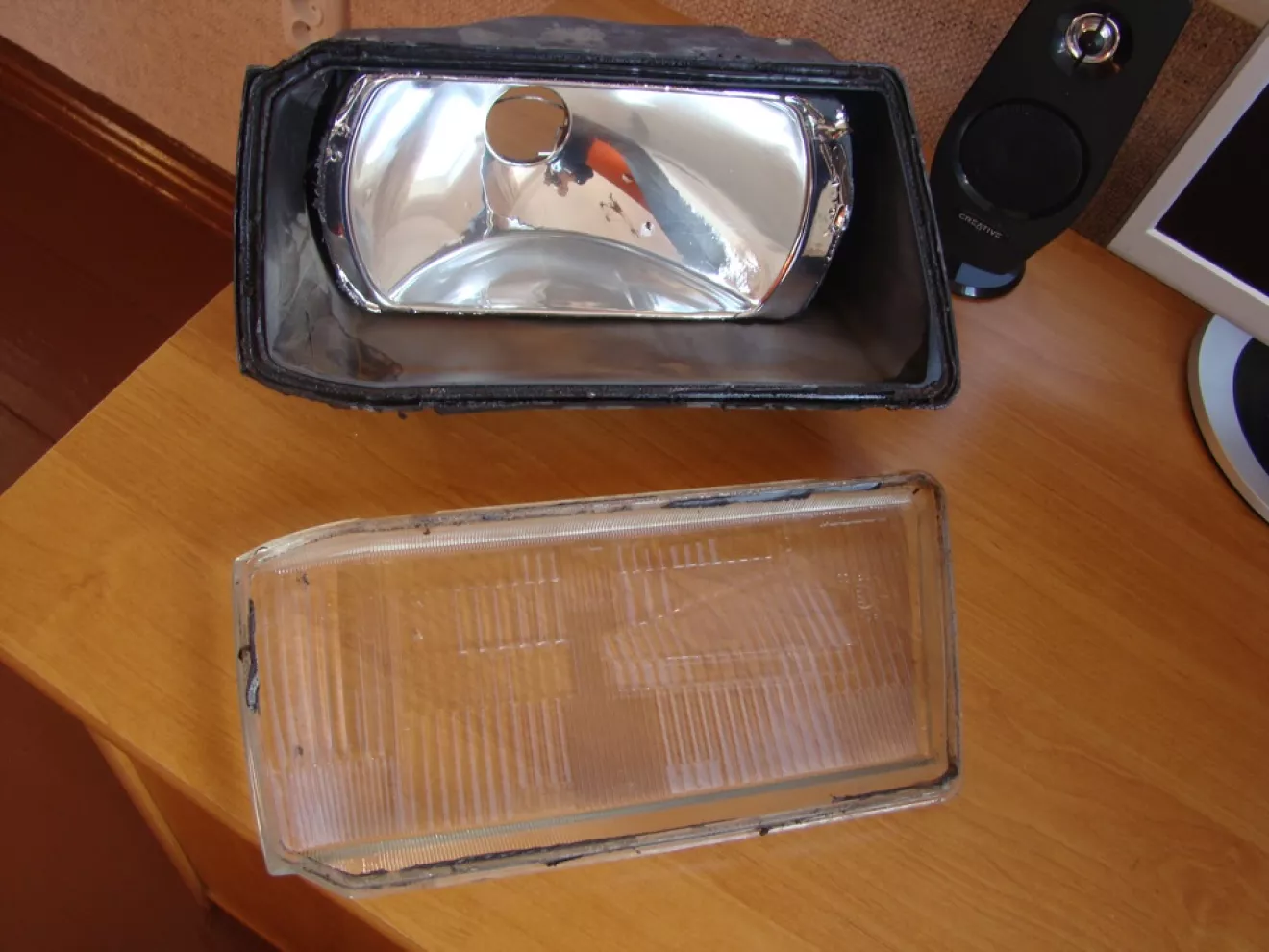 Снял, вторую фару — она не родная, с автомобиля с пробегом, поэтому пластмассовый корпус выгорел и смотрелся гнусно, по сравнению с левой фарой. Решил восстановить эту несправедливость. Снял фиксаторы, подержал фару под горячей водичкой минут пять и "ракушка" открылась.
