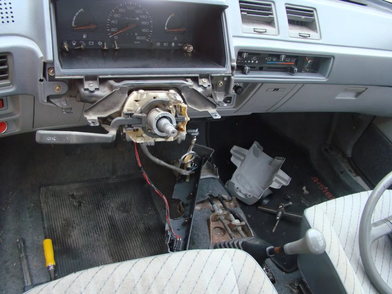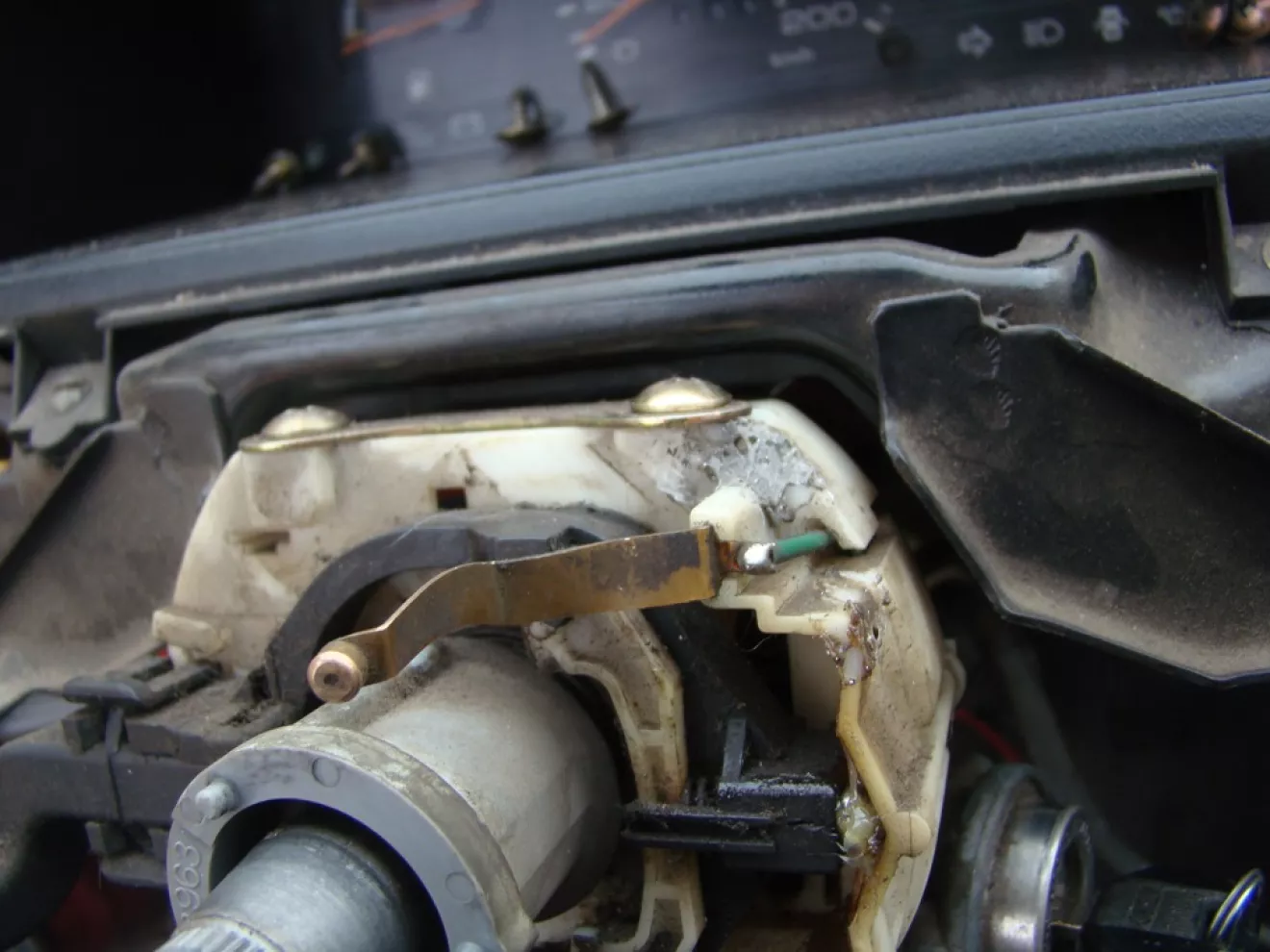 После снятия фары моему взору открылся сигнал, который, кстати, не работал. Проверил питание на нем — плюс приходит. Значит проблема с минусом. Снял руль и вонаночё… контакт, который скользит по рулю отпаль вместе с тем местом, в которое был вставлен. Разбираю еще немножко деталей панели вокруг рулевой колонки и можно припаять пластмаску на место.