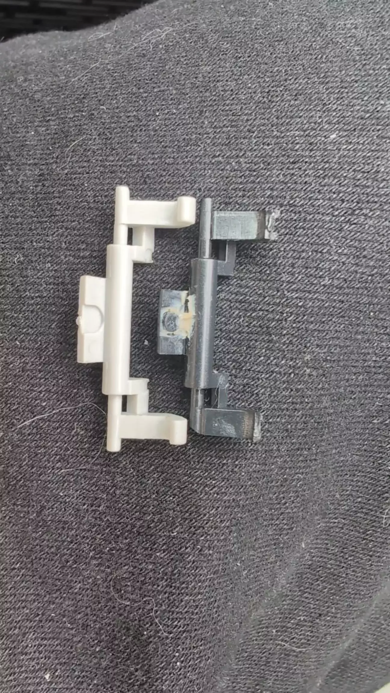 Ось його часта болячка у вигляді частини замка, від якої у всіх відлітають зубчики по краях (чорного кольору). І біла аналогічна запчастина від футляру з Тігуана, яка не стає нам фізично за розміром, і яку раніше я намагався використати як ремкомплект (як самі шарите - безуспішно)