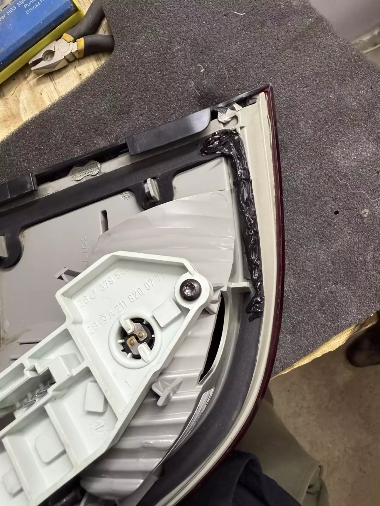 Настав сезон дощів і потрібно буде це терміново зробити. Проблема була в ущільненні ліхтаря, його потрібно було замінити на нове (залишу його парт номер A 211 826 08 91), але так як я за нього забув, а на нове потрібно було чекати близько місяця то в дію пішов план Б.