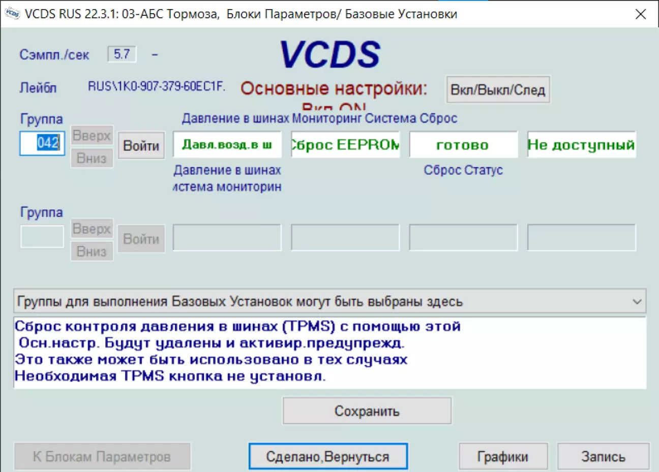 і в полі Група вводимо 042. Цим самим ми обнуляємо всі попередньо збережені записи в памяті і починаємо новий відлік. Обов`язково перед даною процедурою накачати потрібний тиски в шинах і перевірити щоб тиск в шинах був одинаковий. Помилка успішно гасне на панелі приборів.
