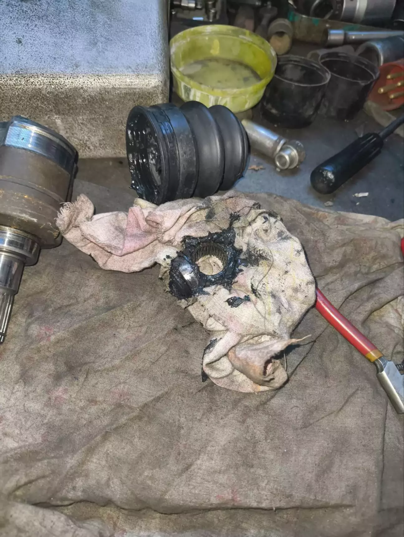 Злили мастило з коробки, перед тим як дістати вісь. Виявляється, якщо не злити хоча б літр, то можна влаштувати душ у боксі, головне сховатись подалі від того, хто полуось буде діставати.