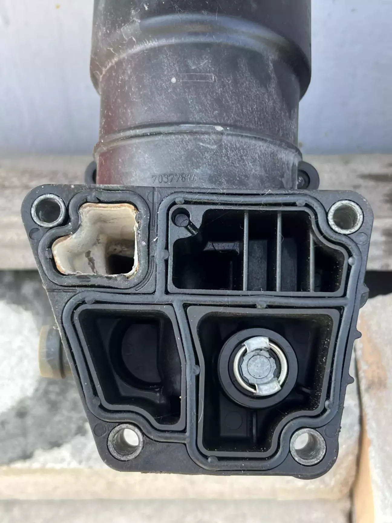 На фото бачимо 2 ущільнювача, більший на 3 секції, ущільнює де масляні канали, менший на каналі антифризу. Бачимо, що ущільнювач на каналі антифризу більш товстий, бо розбух від контакту з маслом, другий норм, маслостійкий. Ось тут, я вважаю, закопана проблема: чому не зробити з маслостіфйкій гуми обидва ущілюнувача? - тоді на каналі антифризу не буде розбухати гума ущільнювача й виламувати перегородки всередину. На новому корпусі ущільнювачи однакові за товщиною, можна подивитись в моєму пості: Заміна компонентів системи охолодження