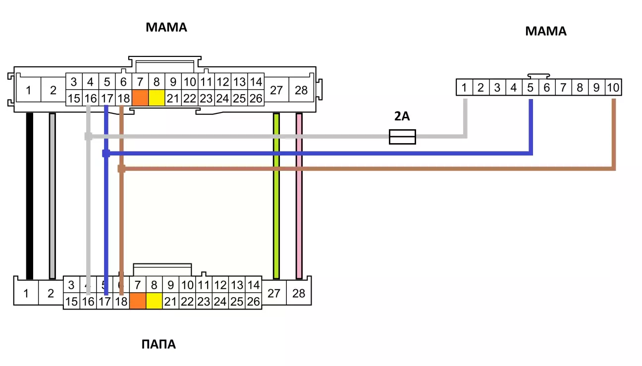 Також видно запобіжник на 2А, в оригіналі він розміщений на 28-ми піновій фішці мама, там є бокові пази для його кріплення