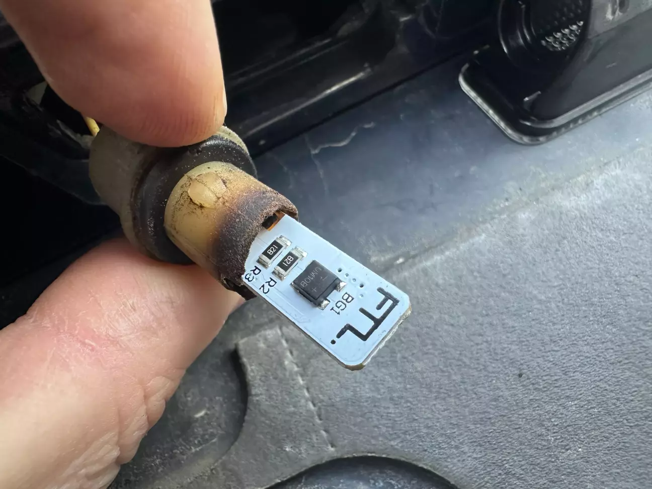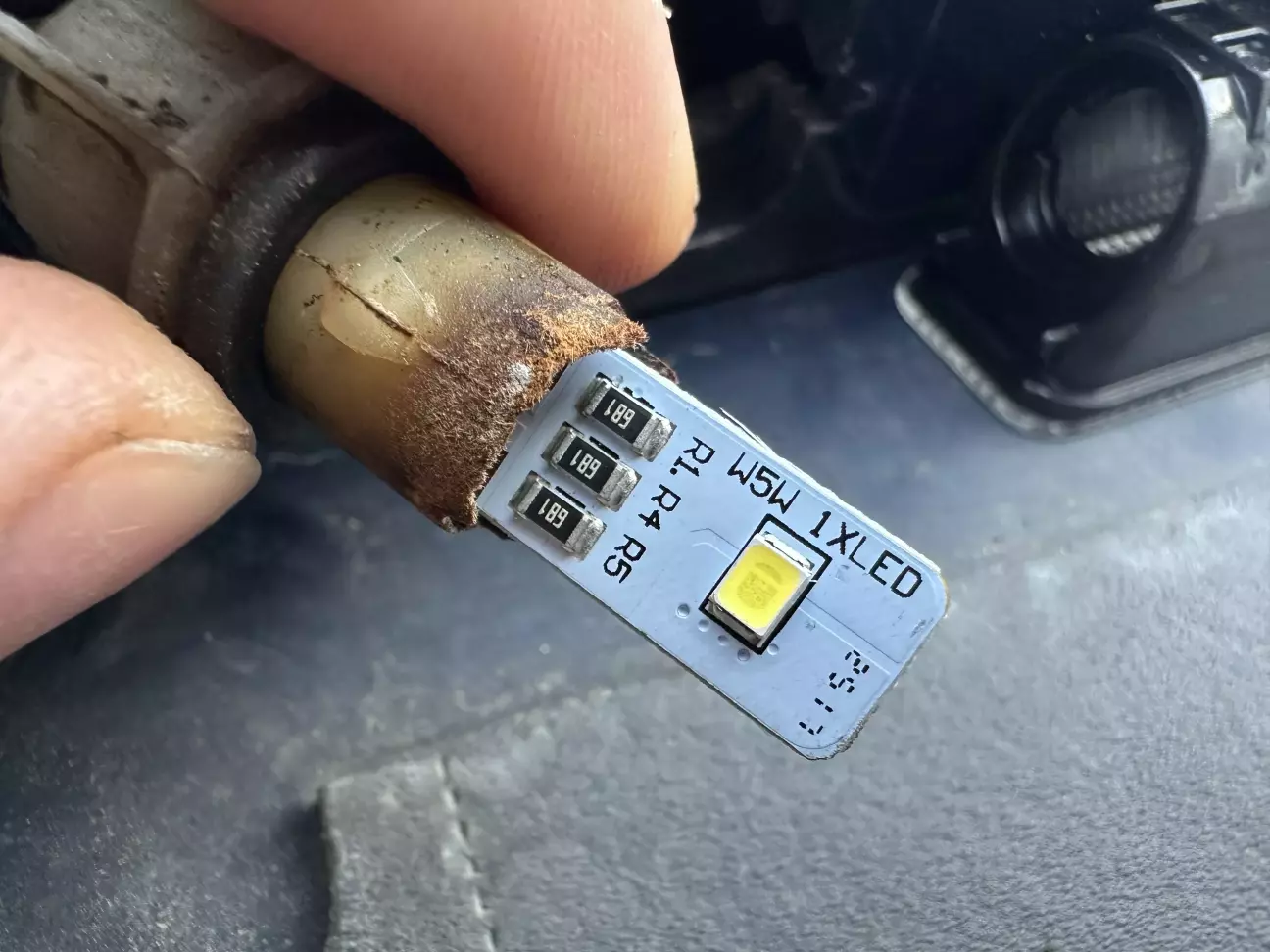 Ввечері зауважив що права підсвітка не працює. Хотів просто замінити лампочку, вийняв пластиковий корпус а місце під лампочку там просто вигоріло. Довелось купляти корпус. Спочатку хотів тільки один, аж тут в каталозі мені трапляється пара ледових за 10$. Я скептично відносився до ледів так як коли закриваєш авто то звичайні w5w гаснуть плавно і приємно. Але ціна халява думаю замовлю. Як буде погано відразу заміню на звичайні.
