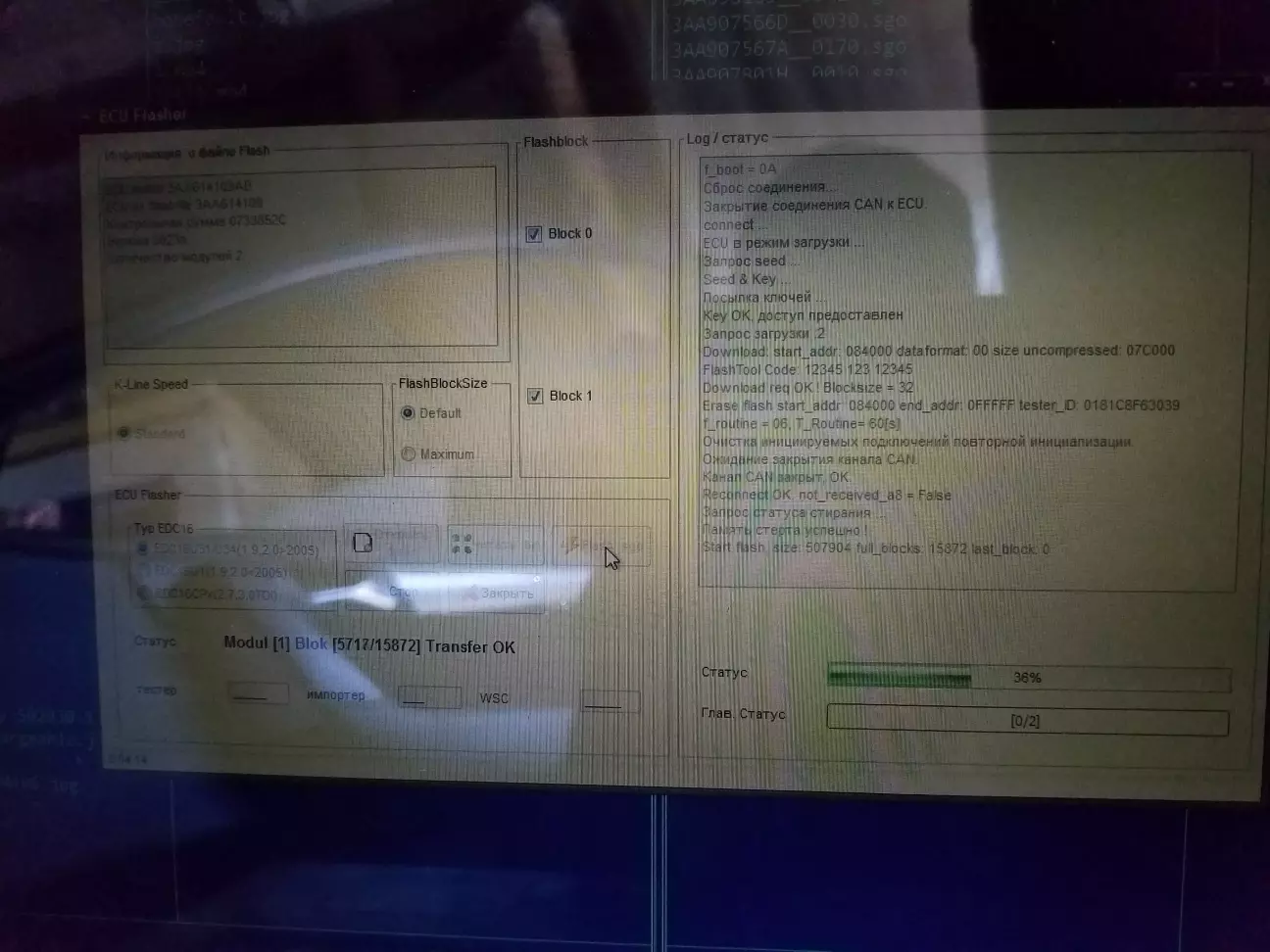 Декілька хвилин терпіння, і прошивка пройшла успішно... Блок був з буквами АВ в кінці, став AJ. Далі проводиво кодування блока, в кодуванні вже вмикаєм адаптивний круїз, а також TPMS (непрямий контроль тиску в шинах) якщо портібно. Також провести базові установки блока АБС.
