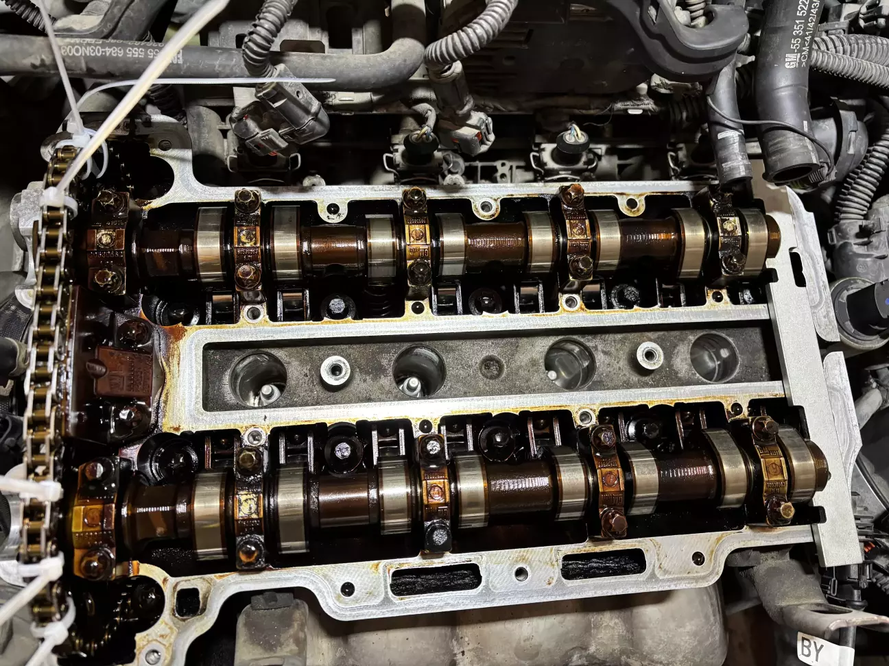 Процесс разбора достаточно прост, снимаем всё мешающие разъемы, трубки с клапанной крышки, катушку. Открычиваем головкой Е10 13 болтов, которые держат крышку и снимаем ее.