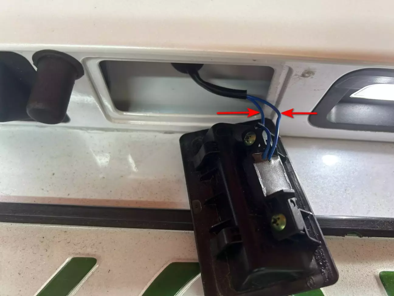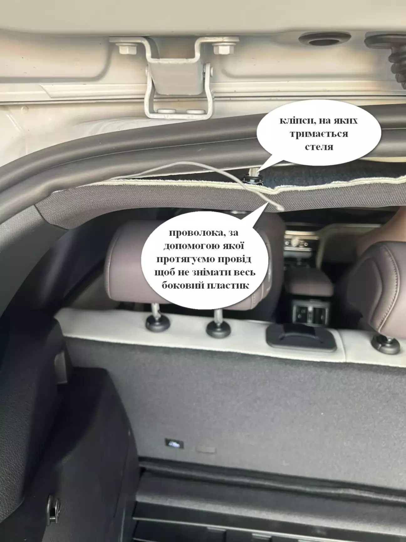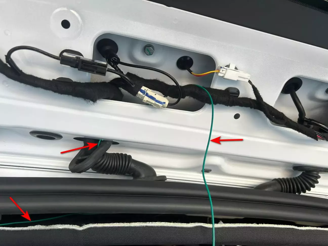 Зелений провід потрібно прокласти в кришку багажника. Зняти резиновий ущільнювач і пластиковою лопаткою стелю зняти з декількох кліпс щоб дістатись резинового з’єднувача кришки багажника з кузовом автомобіля. Просовуємо жорстку проволоку від стелі по лівій стійці внутрішньої частини верхньої пластикової бокової накладки (щоб не знімати її), примотуємо ізоляційною стрічкою до неї зелений провід і витягуємо його до резинового з’єднувача кришки багажника з кузовом автомобіля.
