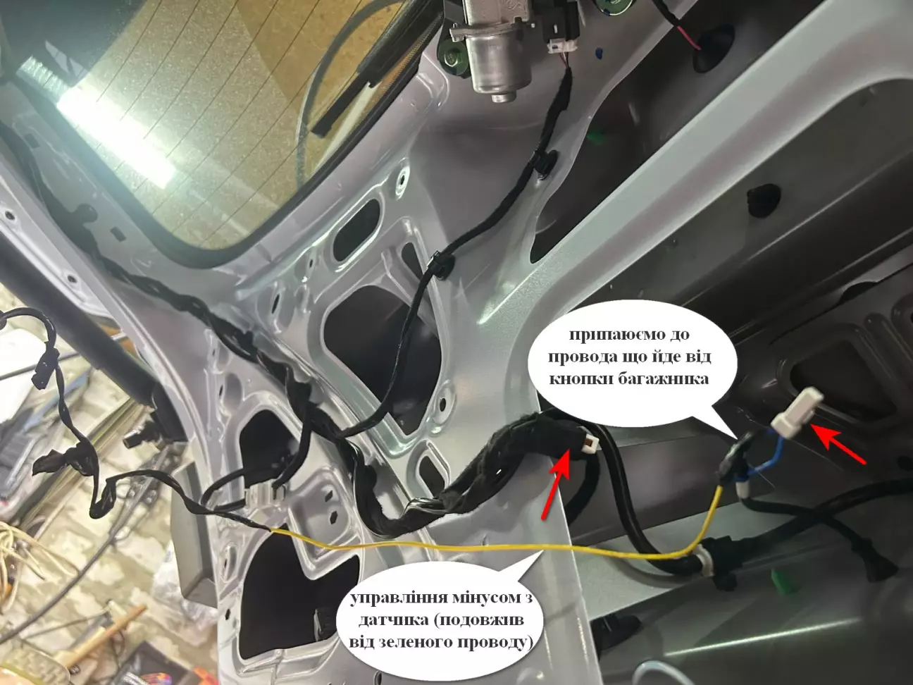 Зняти резиновий з’єднувач кришки багажника з кузовом автомобіля з двох сторін і цією ж жорсткою проволокою завести зелений провід від датчика ноги в кришку багажника.