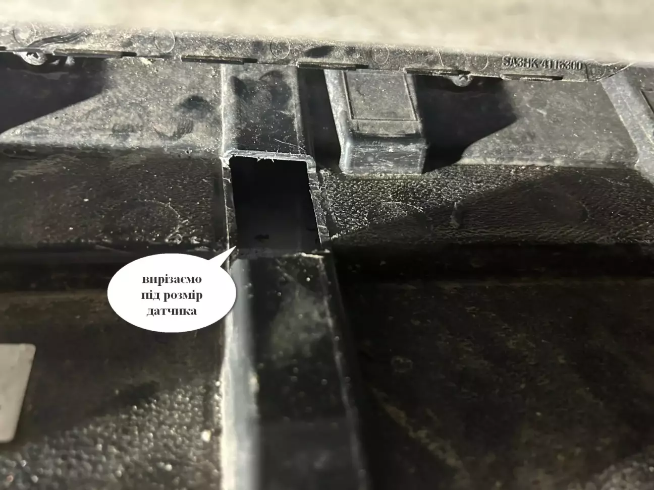 Для цього зрізаємо канцелярським ножом (на внутрішній стороні нижньої пластикової накладки заднього бамперу) частину пластмасового підсилювача по розміру ширини датчика.