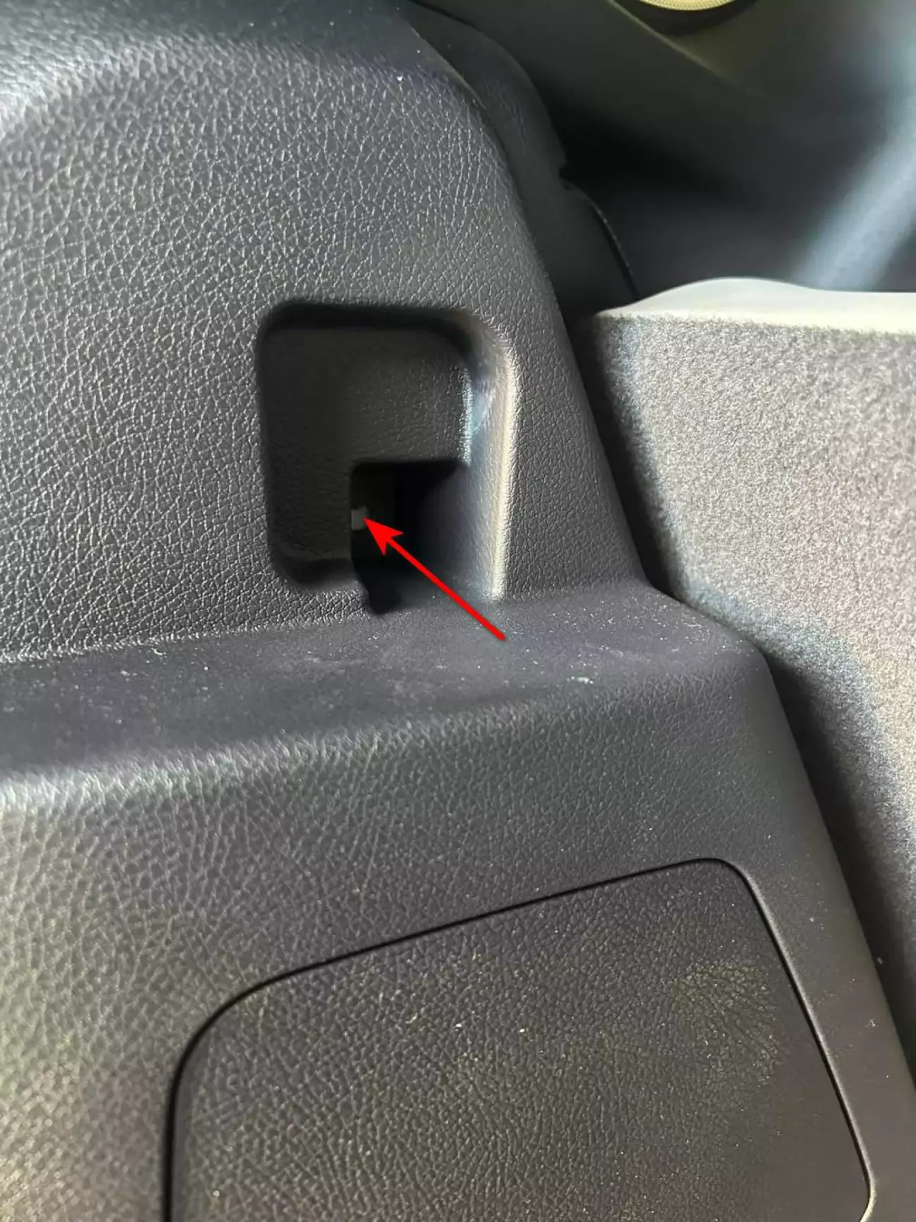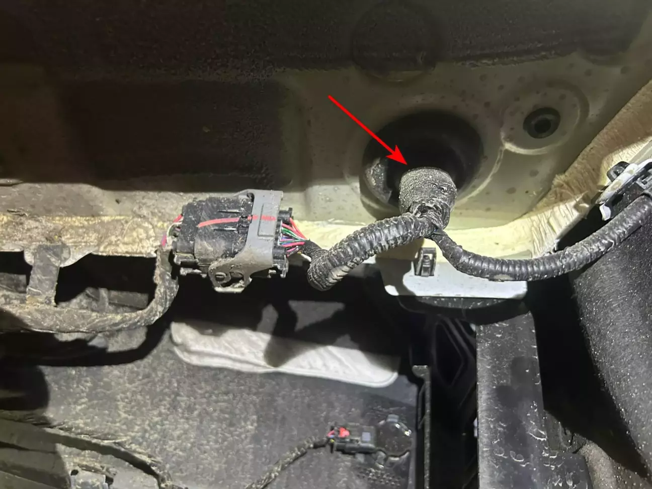 і потягнути її на себе (тримається на кліпсах) щоб був доступ до нижнього блоку і отвору де кабелі переходять з багажного відділення всередину бампера. Просунути через з’єднувальну резинову заглушку ззовні кабель з датчика ноги всередину багажника.