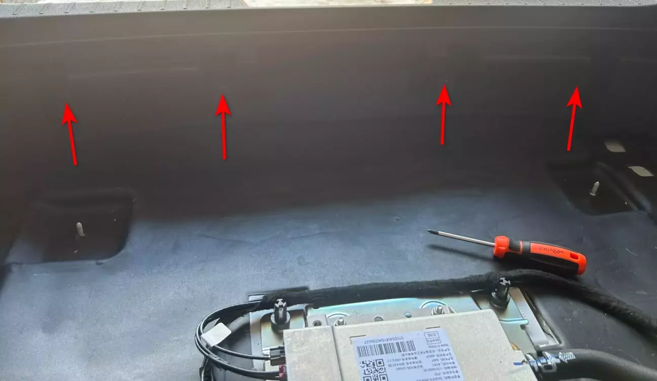 2. Розібрати пластикові накладки кришки багажника (описував ТУТ) і боковий пластик лівої частини багажника. Далі зняти пластикову накладку петлі замка. Для цього вдавити викруткою центральну частину штирка чотирьох кліпс і витягнути їх з посадочних місць (при вставлянні їх назад - штирки кліпс трішки витягнути з кліпс і при вставленні кліпси в накладку вдавити їх всередину).