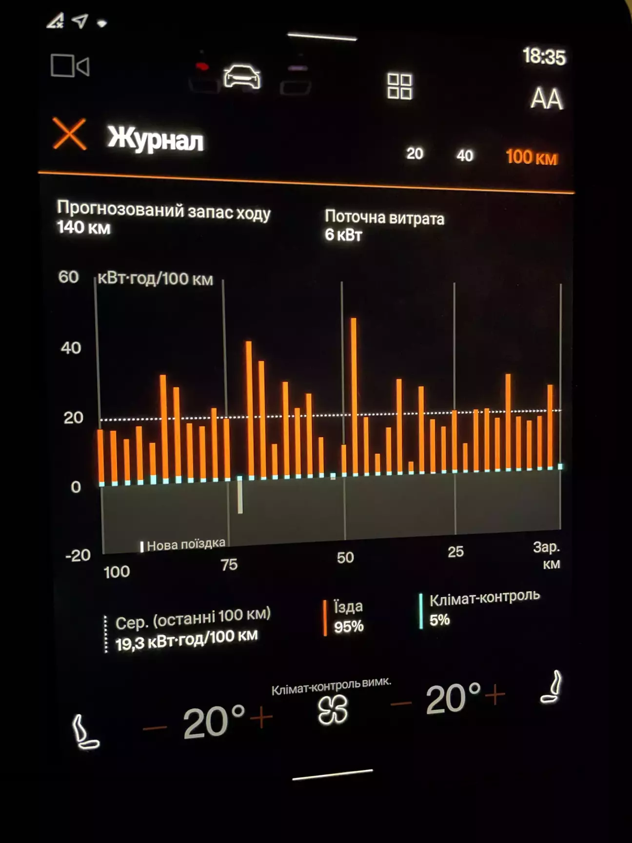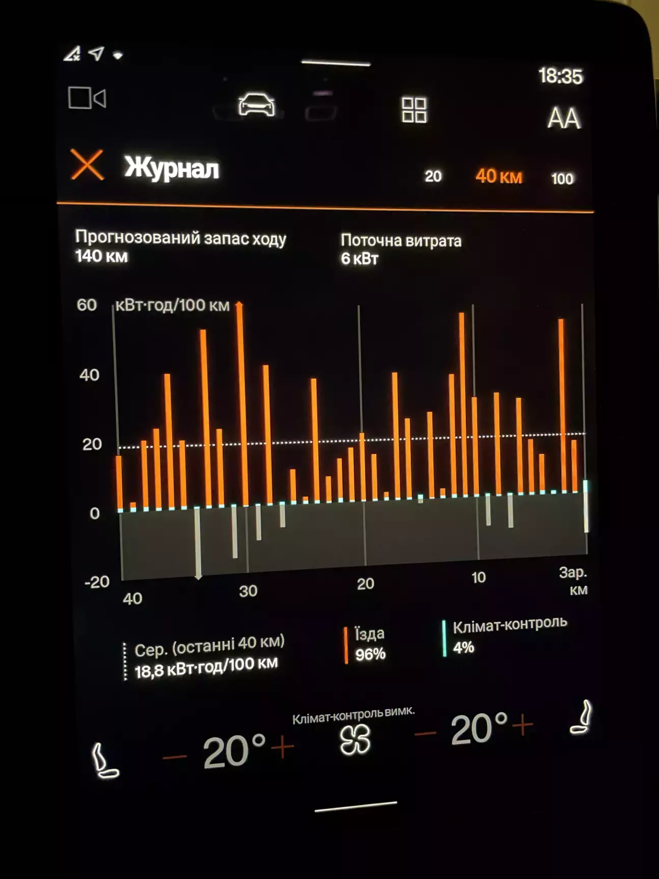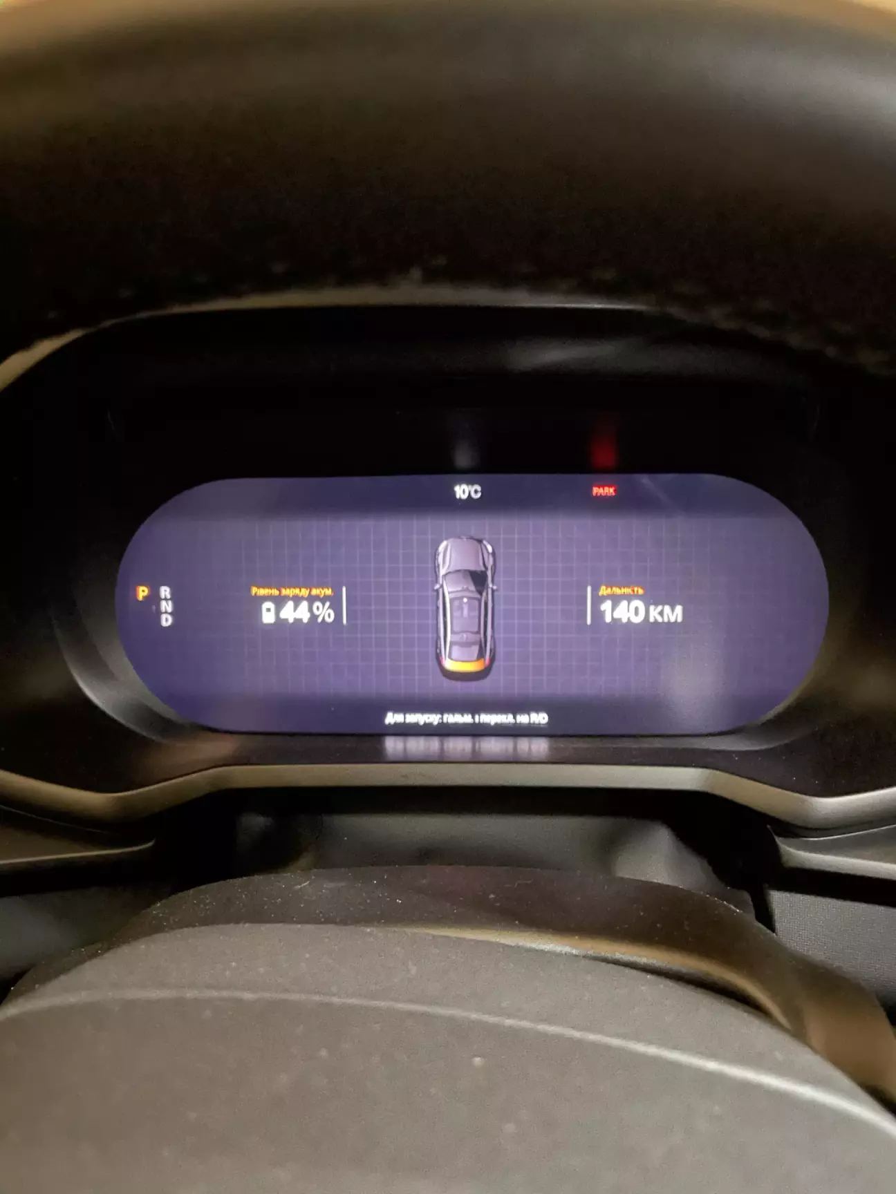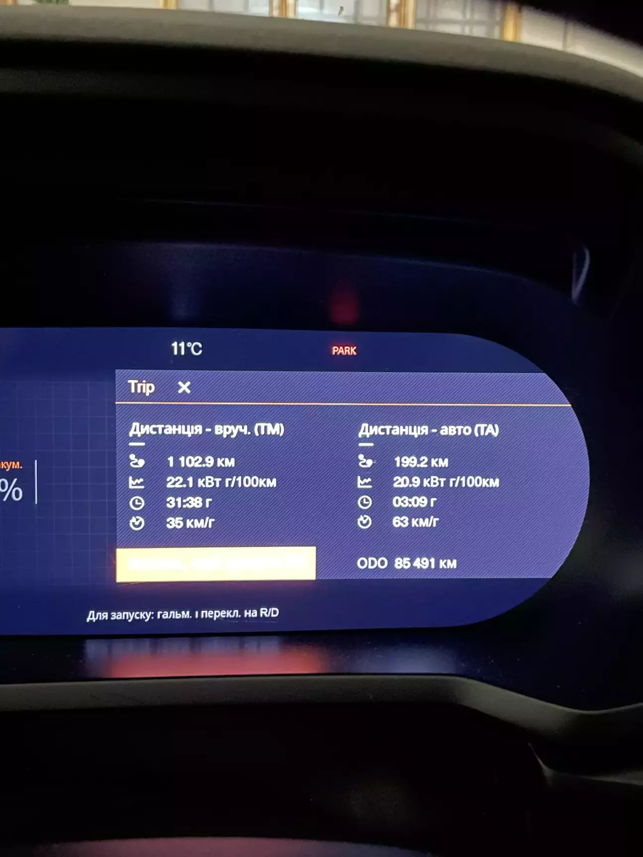 До того часу вже стало темно, тож потестив ще й автодальнє - як на мене, в 98% випадків спрацьовує абсолютно адекватно, приємна функція. Ще порадував асистент безпеки - коли хтось різко перелаштовувався переді мною, то авто трохи пригальмувало і потім знову набрало виставлену на круїзі швидкість. Приїхали додому з залишком заряду 44% - в Камʼянці абсолютно точно зарядка була не потрібна.